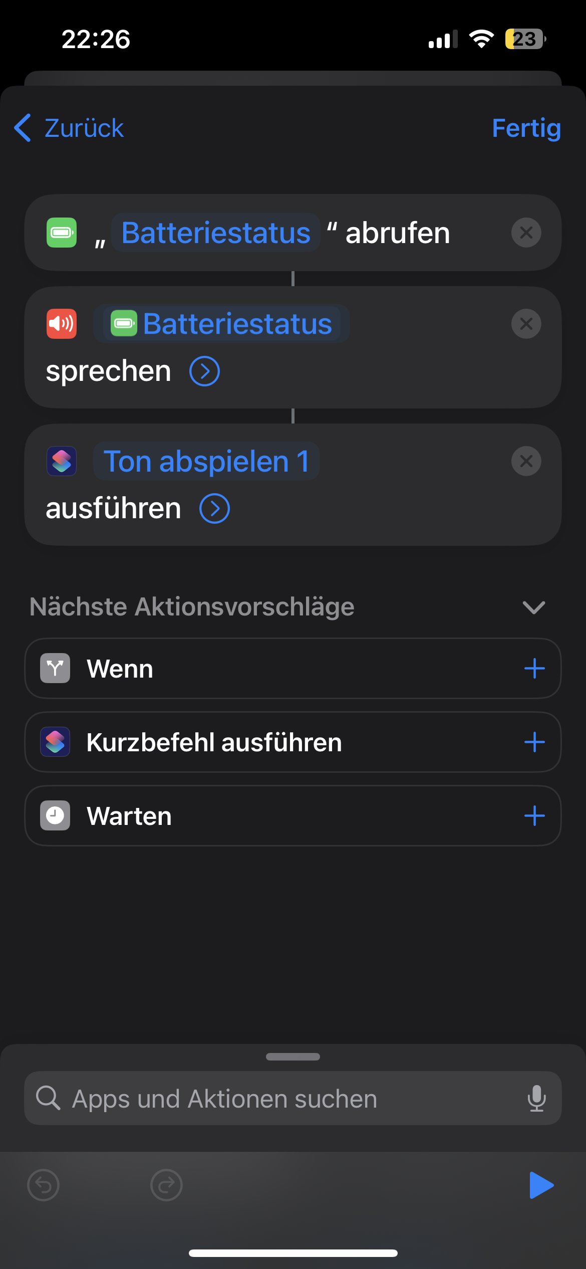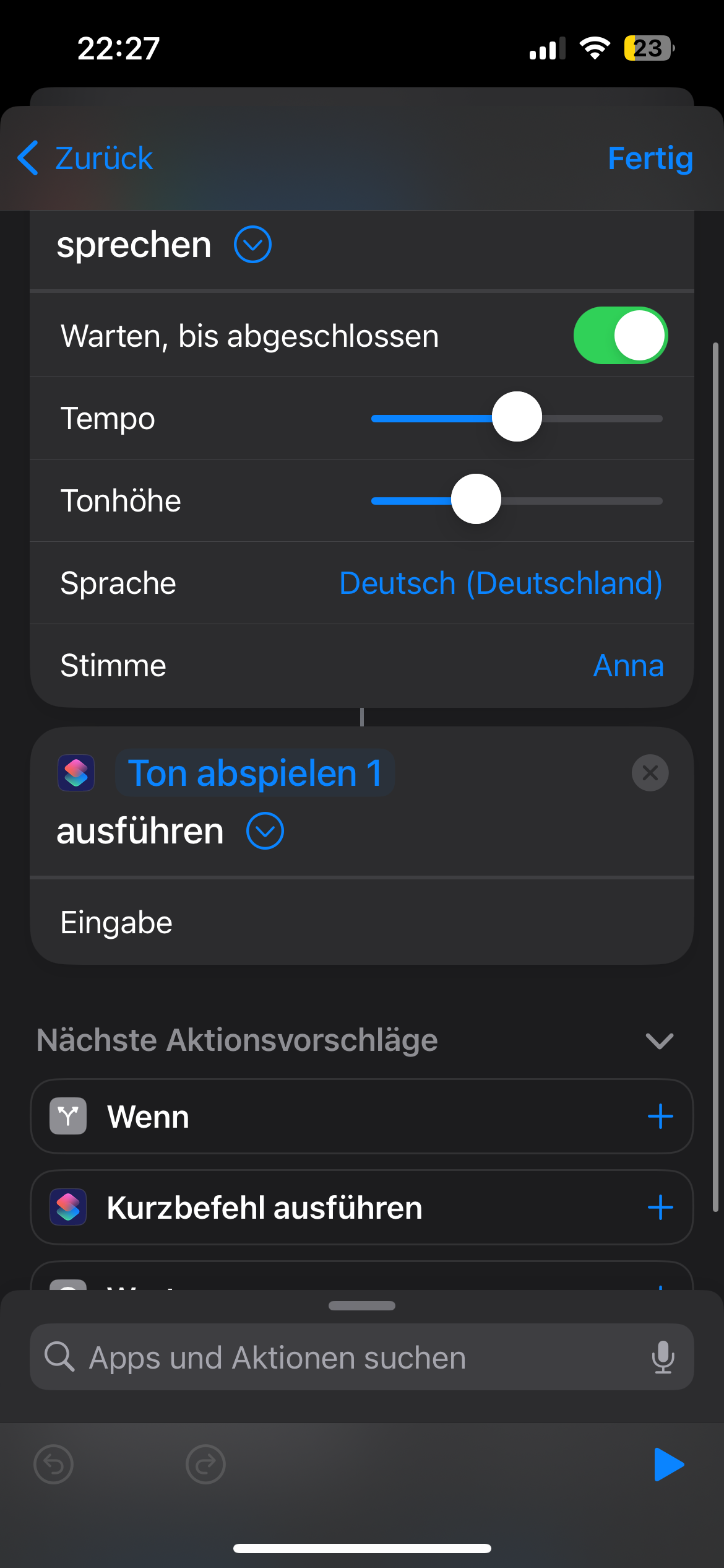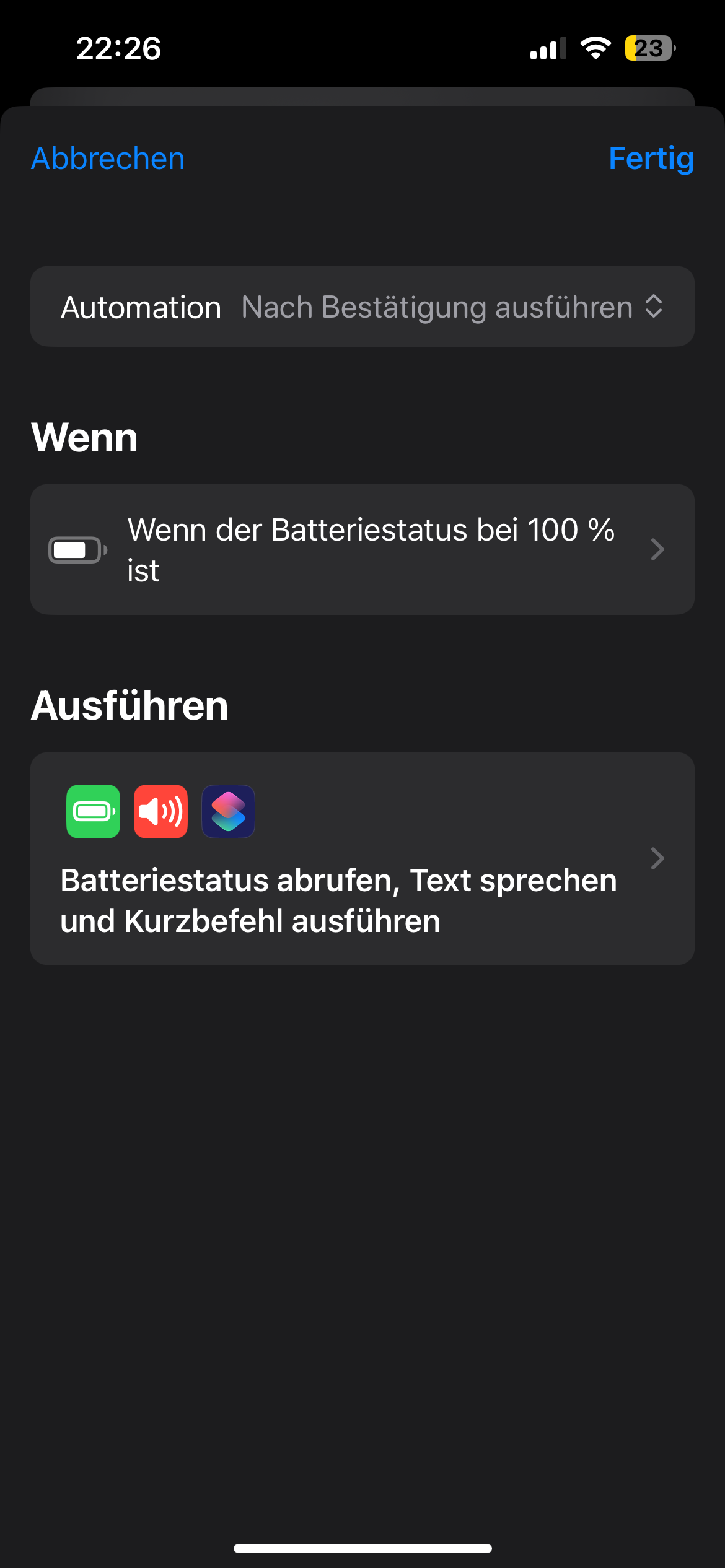 Den Haken bei ist gleich setzen. Und unten auf nach Bestätigung. Das sorgt dafür dass der Kurzbefehl bei 100 Prozent startet. Und Bestätigung ist wichtig damit er auf der Uhr auch angezeigt wird.