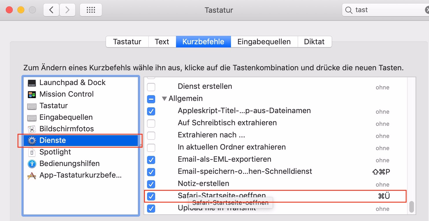 Kurzbefehl "CMD + ü" für das Skript "Safari-Startseite-oeffnen".