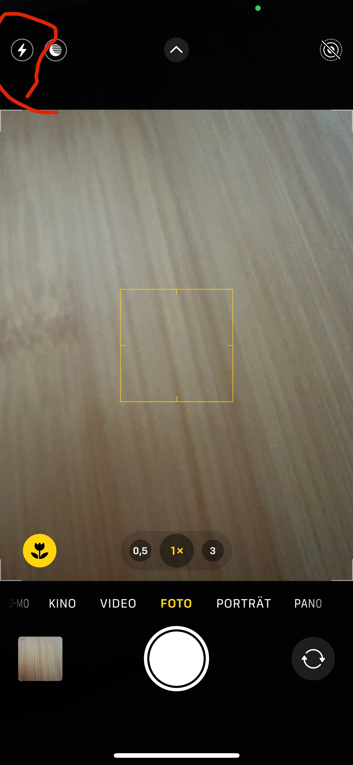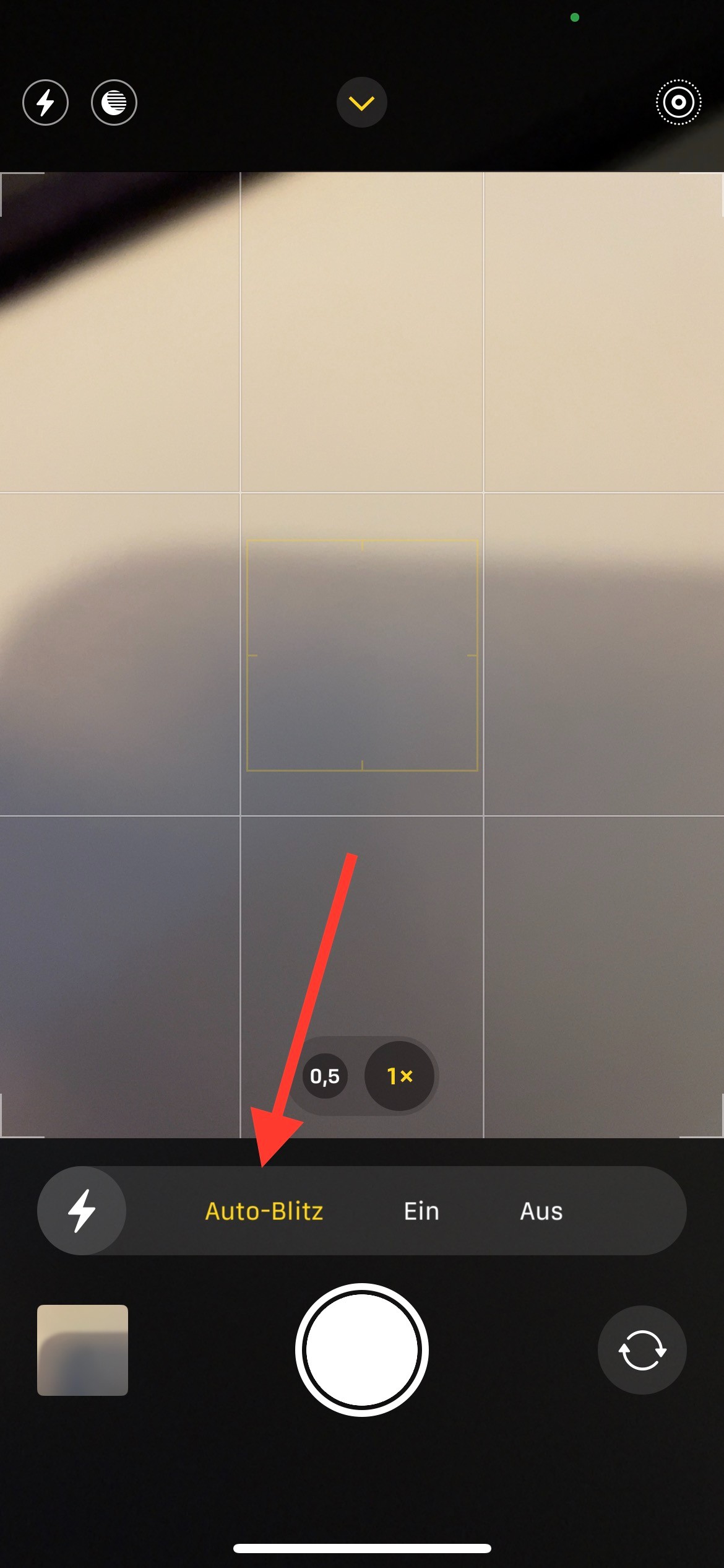 Wenn du in der FotoApp bist, streich mal von unten nach oben, damit du die Einstellungen vom Blitz sehen kannst und dort kannst du von Auto-Blitz auf Ein stellen und dann sollte es funktionieren.