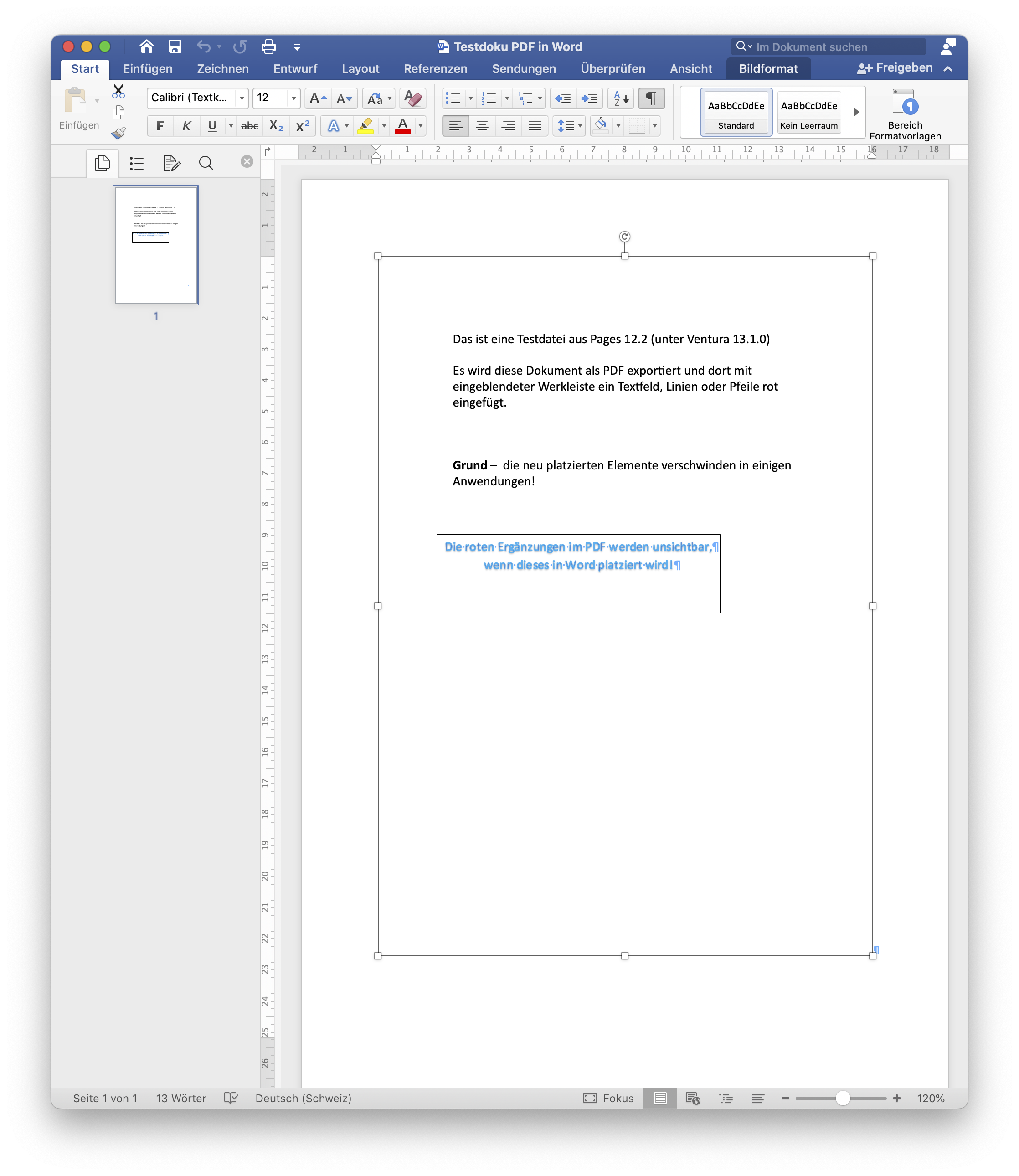 Falls ich ein PDF als ganzes Dokument ergänze mit Textfeldern, Pfeilen oder Rahmen (Shot 1),