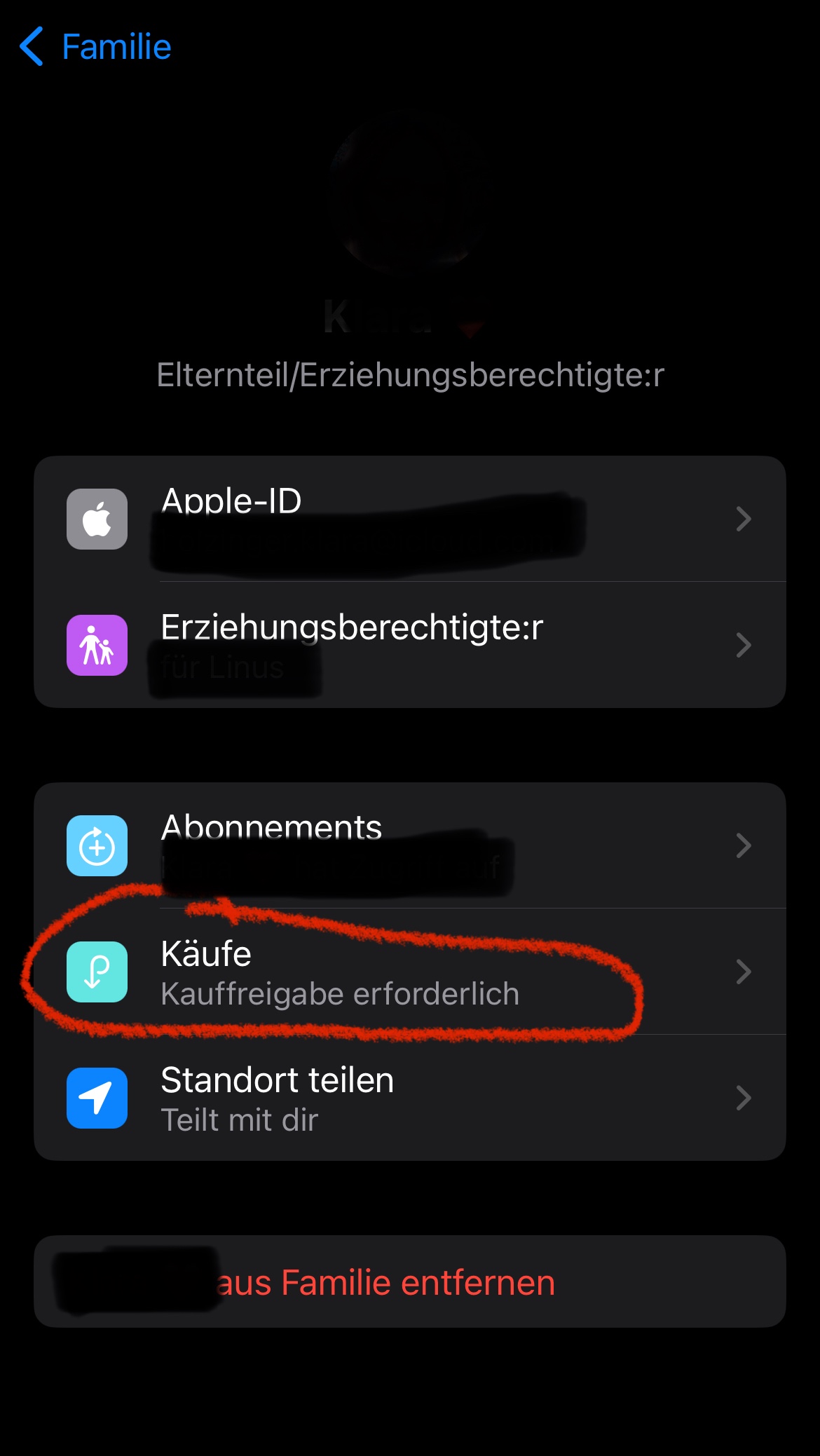 In den Einstellungen unter Familienfreigabe wird die Kaufanfrage auch als Deaktiviert angezeigt. Wenn ich aber meine Frau nochmal draufklicke und reingehe