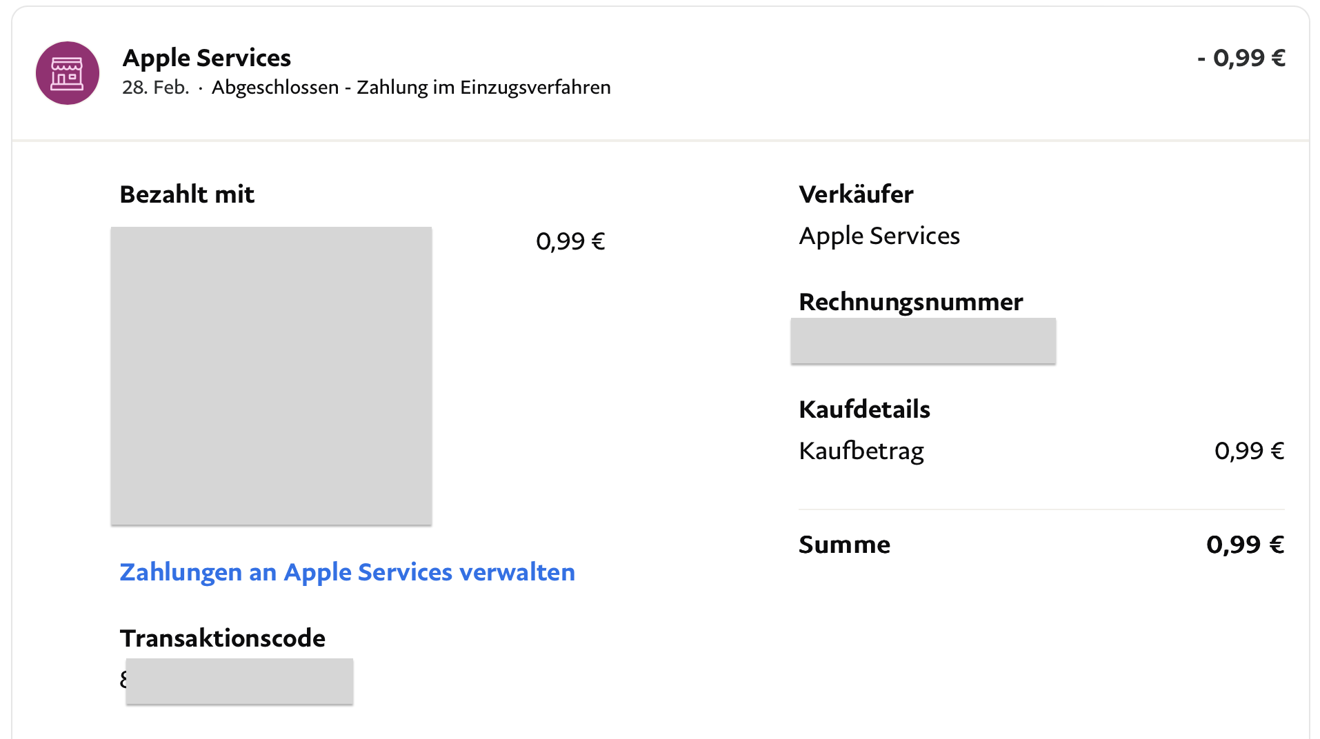 Loggt euch also bei Paypal.com ein und schaut in den Aktivitäten ob es sich tatsächlich um eine Abbuchung von Apple handelt. Mit der Rechnungsnummer kannst du dann Kontakt mit Apple aufnehmen und den Sachverhalt klären: Offizieller Apple Support