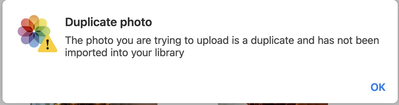 "Bei dem Foto das Du hochladen möchtest, handelt es sich um ein Duplikat, das noch nicht in Deine Mediathek importiert wurde".