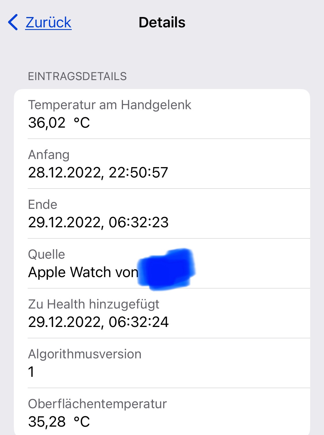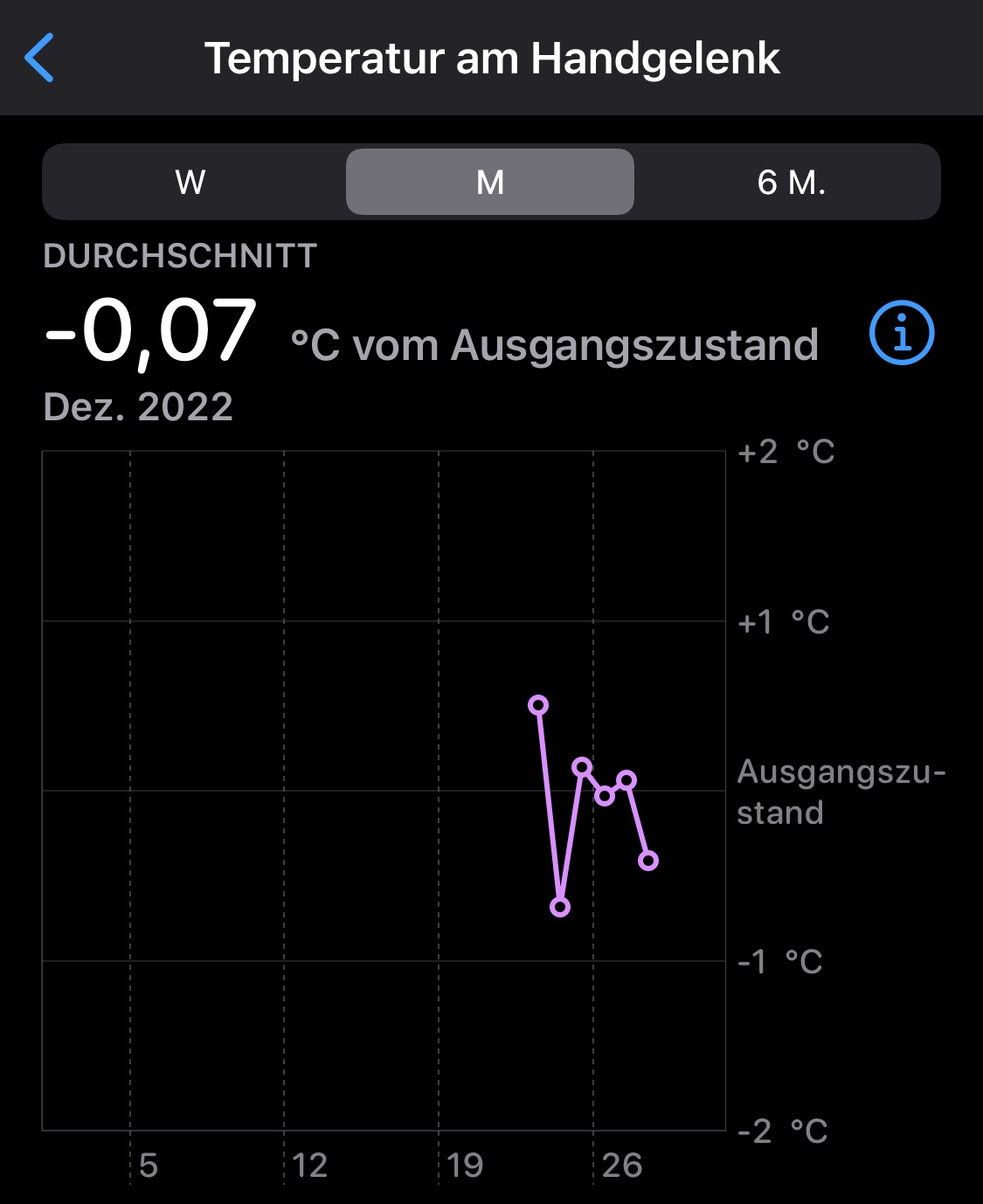 Hinweis: Bei deiner Körpertemperatur gibt es natürliche Schwankungen. Sie kann auf Grund einer Vielzahl variabler Faktoren von Nacht zu Nacht unterschiedlich sein. Die Temperatur am Handgelenk kann auch durch äußere Faktoren wie deine Schlafumgebung beeinflusst werden.