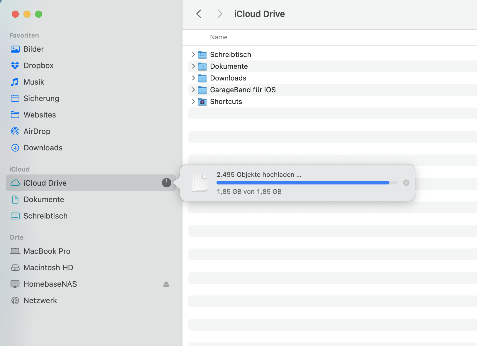 ich habe vor ein paar Tagen in den iCloud-Drive Einstellungen die "Schreibtisch und Dokumenten" Synchronisierung aktiviert. Beim Hochladen der Daten, knappe 1,9 GB, bleibt die Synchronisierung immer kurz vor Schluss stehen und geht nicht weiter. Hab das Häkchen schon mehrfach wieder rausgenommen und die Prozedur neu gestartet, aber es endet kurz vor Schluss. Auf meinem iPhone in den Dateien kann ich von den beiden Ordnern auch noch nichts sehen. Kann man da irgendwas machen? Mittlerweile warte ich beinahe 2 Tage und es tut sich nichts. macOS Version ist Ventura 13.0.1