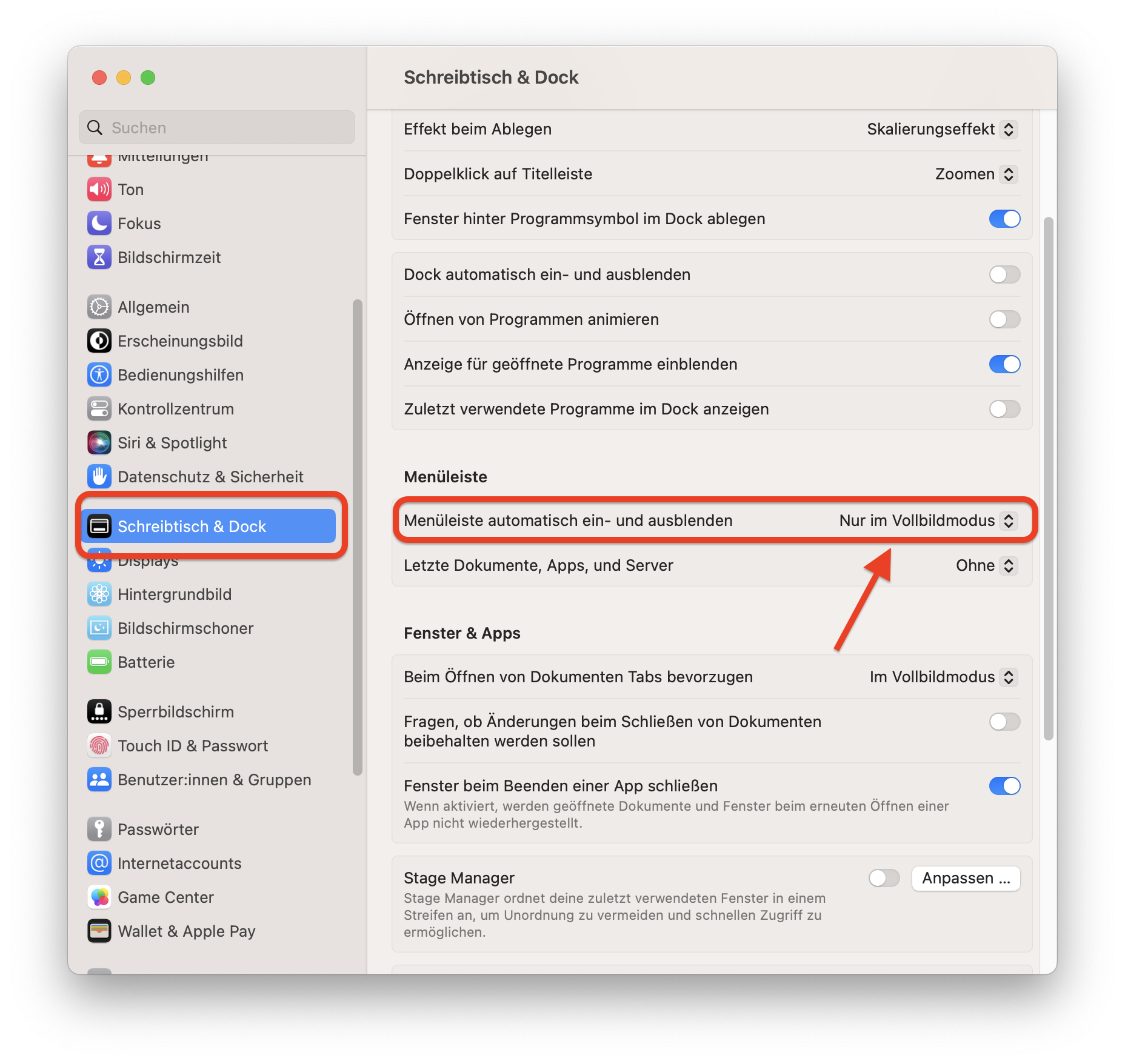 Öffne dazu die Einstellungen und wechsle rechts in den Bereich Schreibtisch & Dock. Unter Menüleiste kannst du nun die Option Menüleiste autom. ein- und ausblenden auf "Nie" umstellen.