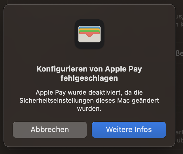 Nach einer Neuinstallation auf einer verschlüsselten Festplatte ist ApplePay deaktiviert obwohl die höchste Sicherheitsstufe eingestellt ist. Jetzt sogar mit FileVault verschlüsseltem Startlaufwerk.