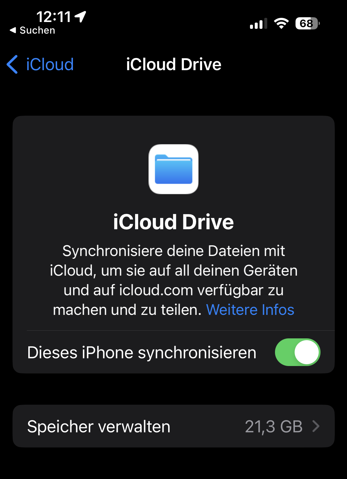 Dieses Problem habe ich nur auf meinem iPhone. Mein iPad, oder auch das MacBook zeigt (bei identischer Syncronisationseinstellung) diesen Fehler nicht. Zudem ist der Fehler nicht plausibel, da ich Dateien, die ich auf iPad oder MacBook auf iCloud Drive ablege in wenigen Sekunden auch am iPhone abgerufen oder bearbeitet werden können. Ebenso umgekehrt, wenn ich einen Screenshot, z.B. den angehängten auf dem iPhone in iCloud Drive speichere, so kann ich ihn vom MacBook aus hier einfügen.