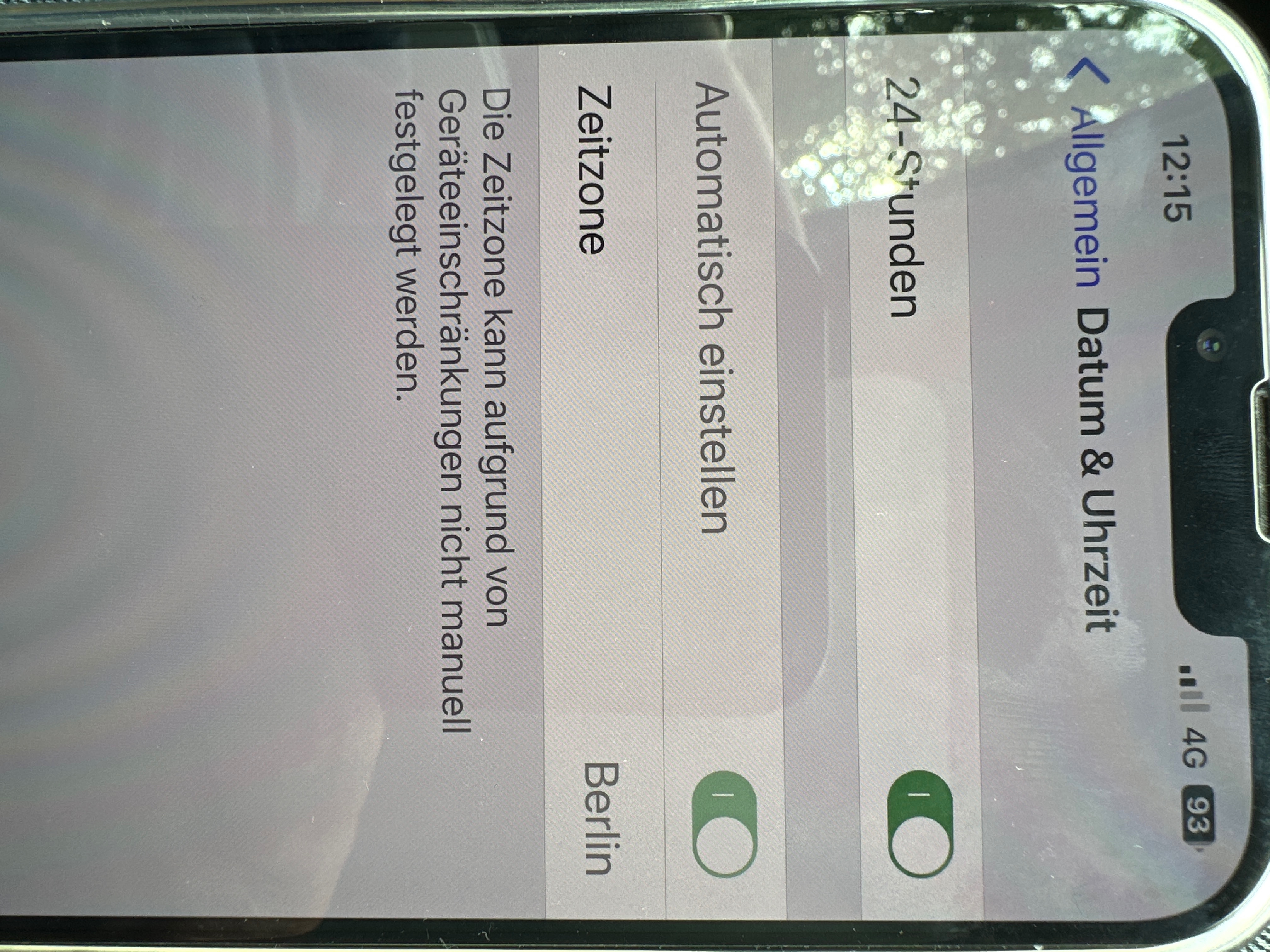 Hallo! Ich wollte die Zeitzone gerade auf manuell einstellen, doch da stand nur „Die Zeitzone kann aufgrund von Geräteeinschränkungen nicht manuell festgelegt werden.“