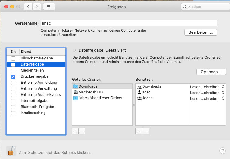 • Dateifreigabe - deaktiviert - kann ich nicht einschalten und es erscheint auch nicht der grüne Punkt.