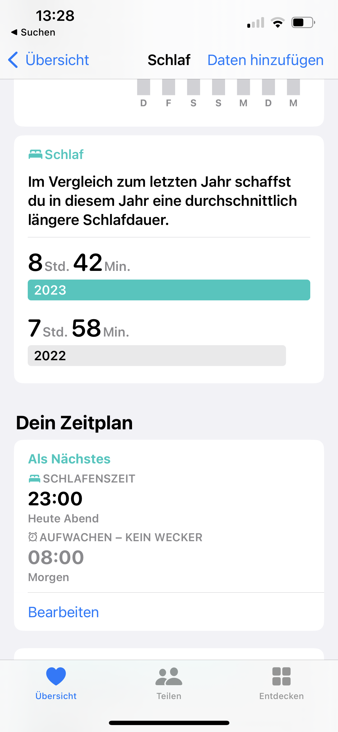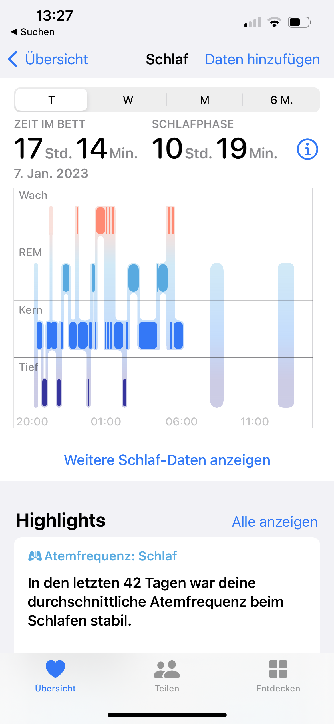 Schau mal auf deinen ersten Screenshot: du hast eine „Zeit im Bett“ von über 17 Stunden! Und deine „Schlafphase“ ist hingegen nur knapp über 10 Stunden. Allein die Zahlen und auch der Abstand zwischen den Zahlen ist schon der Hinweis, dass du keinen Zeitplan definiert hast.