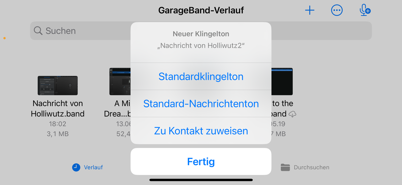 Einziges Problem ist, dass dieser Nachrichten-Ton nicht permanent in der Auswahlliste bleibt, sondern verschwindet, wenn man mal zu einem anderen Ton wechselt. Man muss die Prozedur mit dem Teilen und zuweisen aus Garage Band dann jedes Mal neu ausführen.