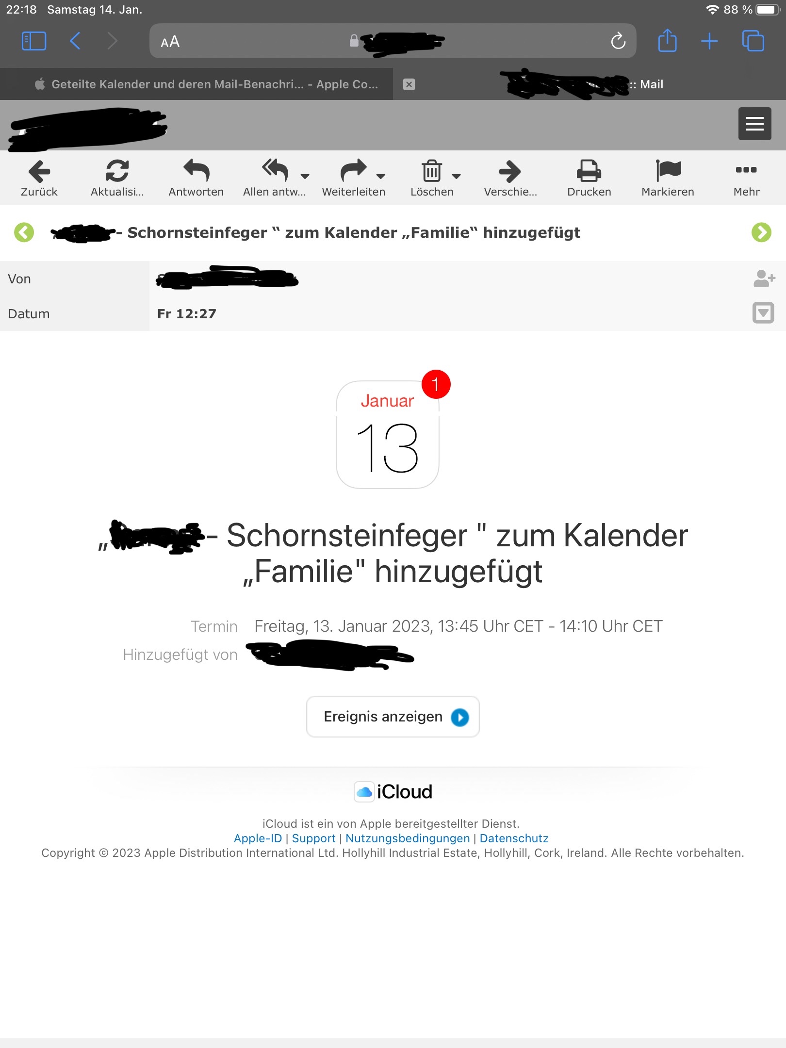 1.: Wenn ein anderes Familienmitglied Einträge erstellt oder löscht, erhalte ich innerhalb der Kalender-App unter "Eingang" keine Benachrichtigungen, sondern nur Mail-Benachrichtigungen. Ist das richtig so? Ich war der Annahme, dass Änderungen aller Art von einem Familienmitglied dann bei allen anderen Mitgliedern des entsprechenden Kalender als Info über den Eingang der Kalender-App angezeigt werden.