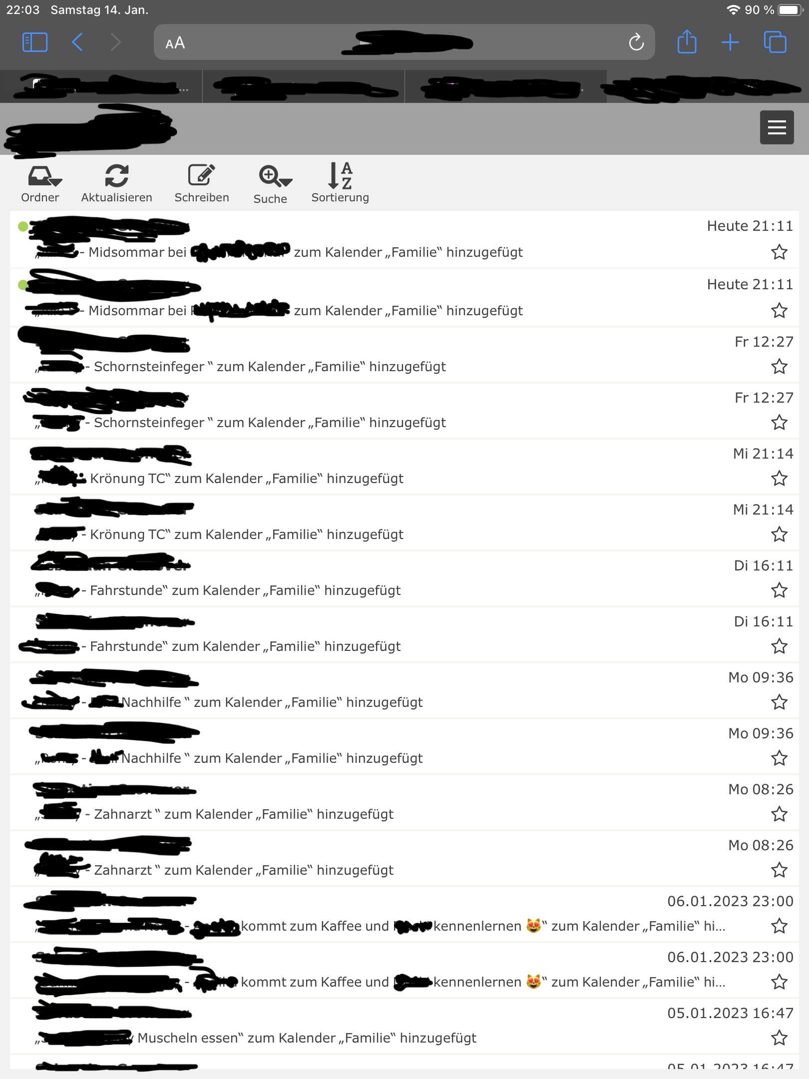 Hat auch das so seine Richtigkeit? Habe immer das Gefühl, dass da im Hintergrund irgendwo ein Fehler ist und ich traue dem Kalender nicht so ganz über den Weg, also mich darauf so ganz und gar verlassen ist irgendwie nicht drin. Zu gelöschten Einträgen anderer Personen erhalte ich übrigens nur eine einzige Mail, nimmt eine Person Änderungen vor, erhalte ich keinerlei Info-Mail darüber.