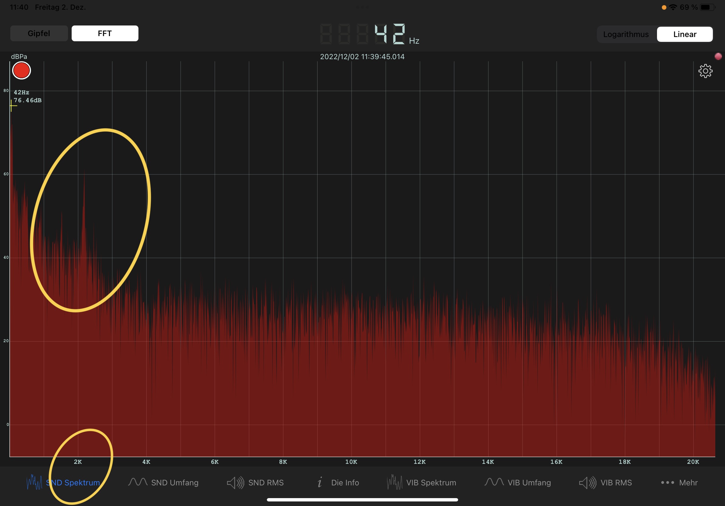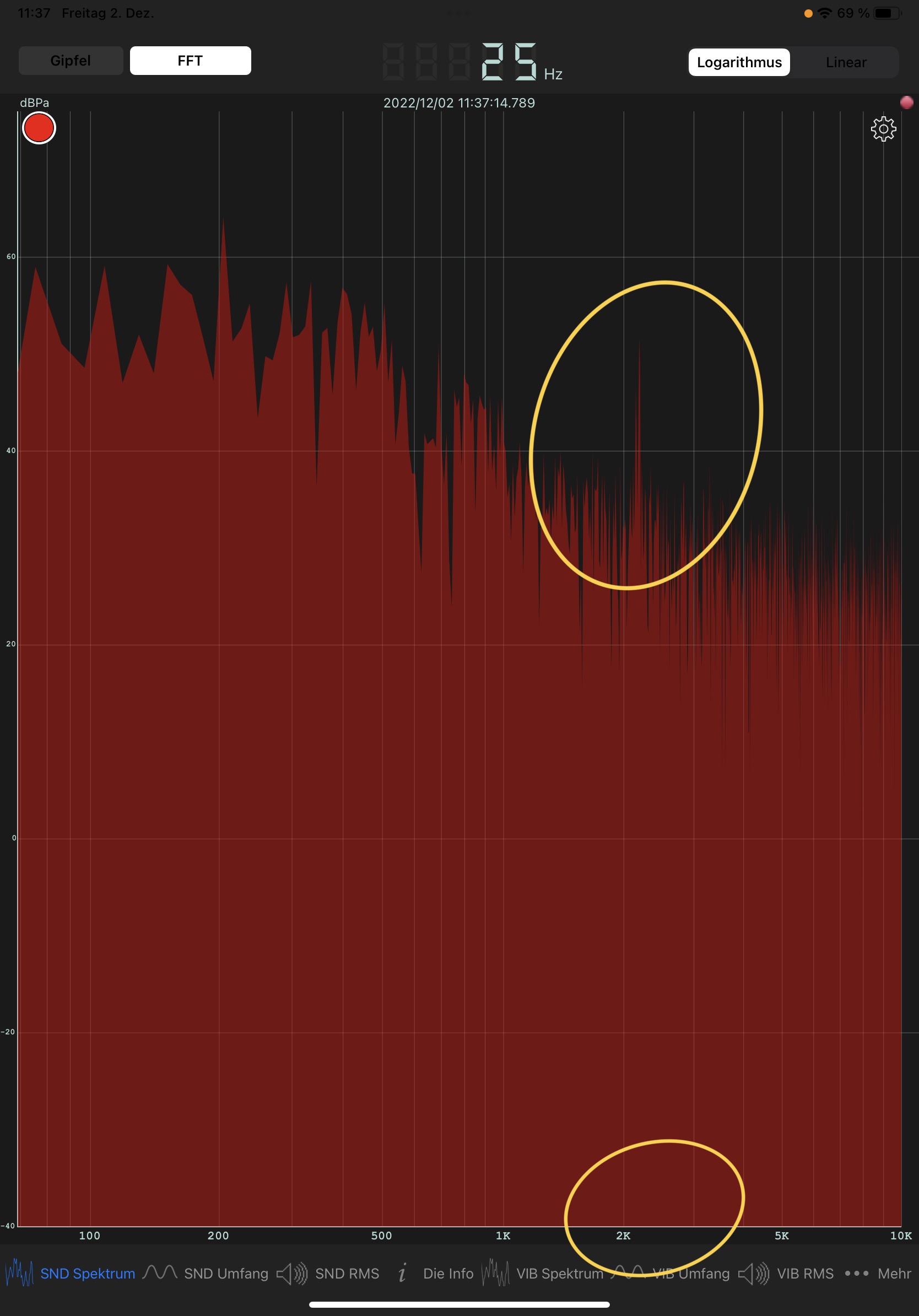 Vielen Dank für deine Zeilen, Problembeschreibungen, wobei die Diagramme, abgesehen von dem 2 kHz Peak, in ihrer Gesamt Belastung extrem divergent sind, Bild 2 im mittel mit 35 dB, sowie Bild 1 mit 40 - 60 dB, was ist deren Ursache? Unterschiedliche Abstände? Hast Du bereits eine Rückmeldung von Apple bekommen, ggf. erneut noch einmal kontaktiert?