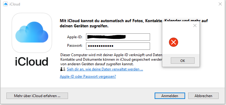 Anmeldung in der iCloud auf Windows 10 ist nicht mehr möglich