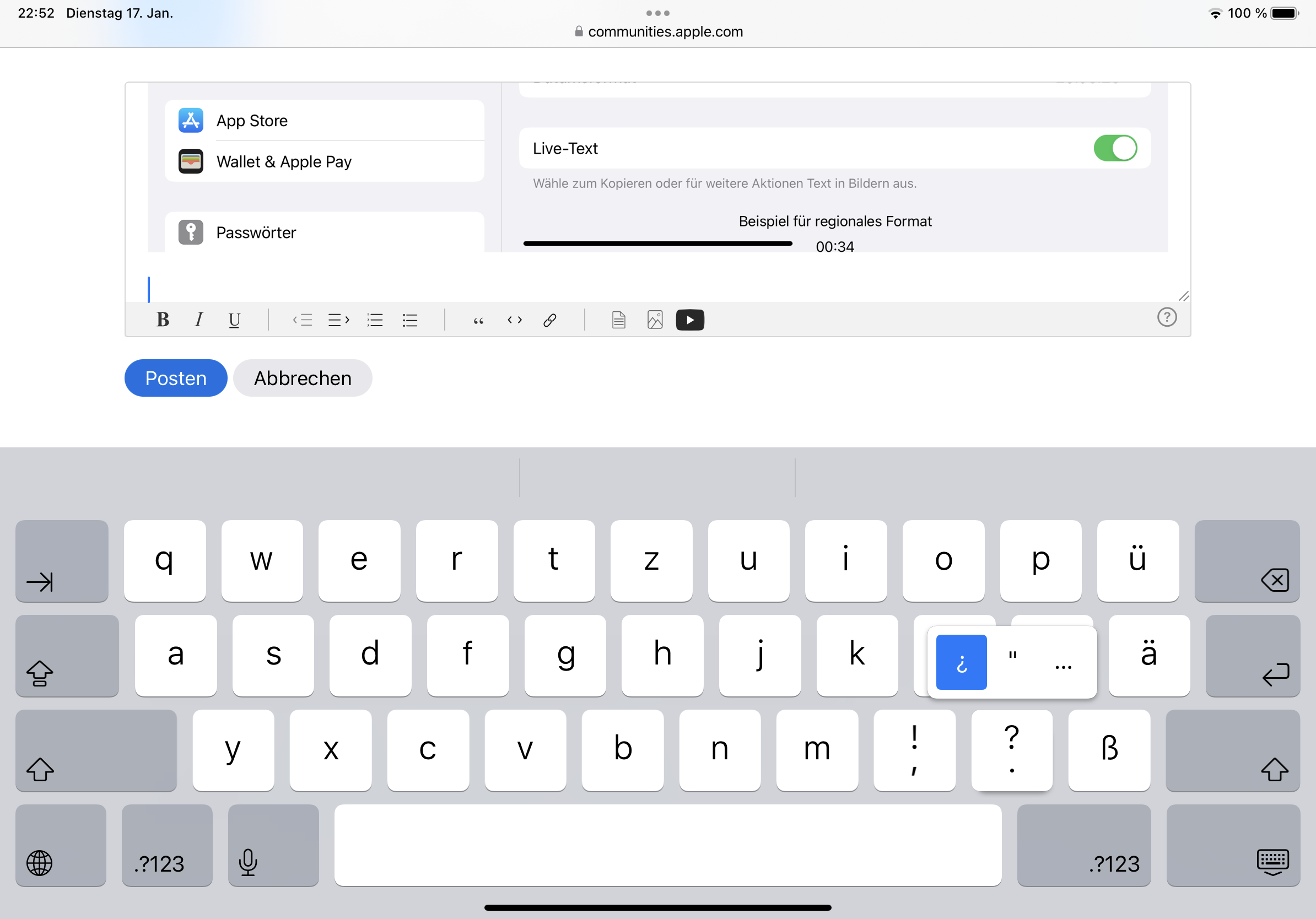 iPad mit iOS 16.2 bei Tastatur Ausrufezeichen und Fragezeichen falsch herum
