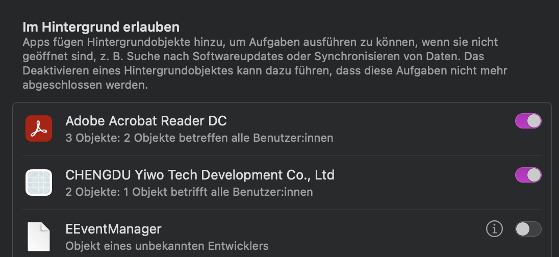 Danach habe ich eine Info bekommen, dass eine Anmeldeoption sich geändert hat, habe mir das angeschaut und unter "Allgemein > Anmeldeobjekte > Im Hintergrund erlauben" das Objekt "CHENGDU YIWO Tech Development Co., Ltd" entdeckt. Ich habe keine Ahnung was das ist. Scheinbar ist es nicht von einem unbekannten Entwickler. Durch Nachforschungen wurde ich nur insoweit schlau, dass es wohl zu "EaseUS" gehört und irgendwas mit Datenverlust und Wiederherstellung zu tun hat.