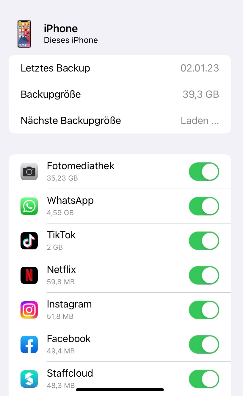 Mein Backup für mein Iphone 11 ist viel zu gross. Es werden 36,6 GB dafür benutzt. Dadurch ist mein ganzer Speicherplatz voll (50 GB).