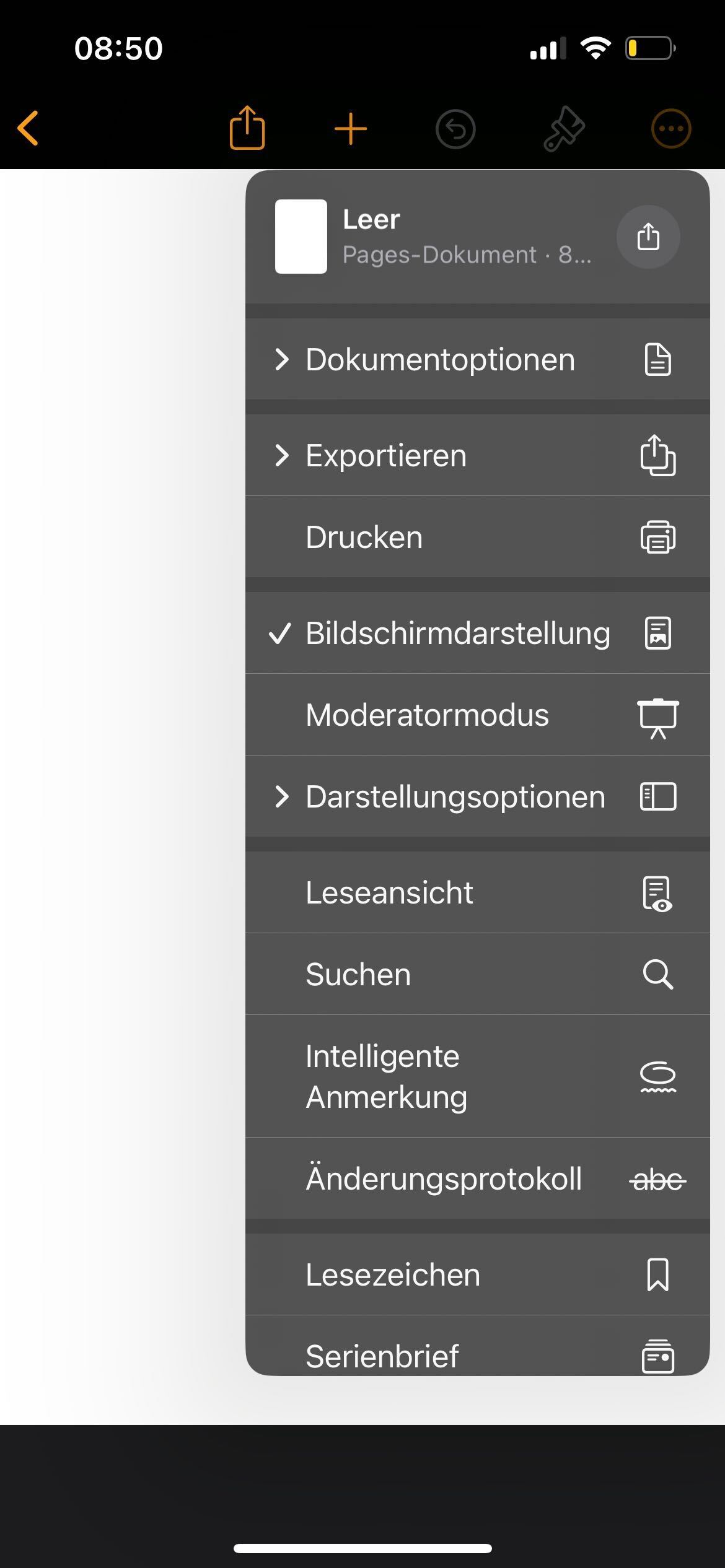 Ich habe bei mir selbst nachgeschaut und ich habe die Druck-Option angezeigt bekommen, nachdem ich in einem Pages Dokument oben rechts auf die drei Punkte gedrückt habe.