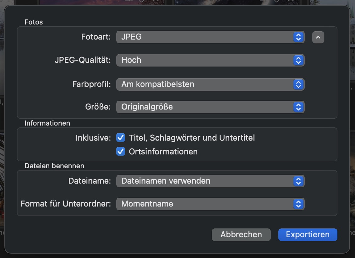 Ich würde die Bilder so exportieren, dass sie in Unterordnern liegen, die nach dem Moment benannt sind, und zwar sowohl die unbearbeiteten Originale als auch die bearbeiteten Versionen. Dann enthalten die Ordnernamen den Aufnahmeort und das Aufnahmedatum.