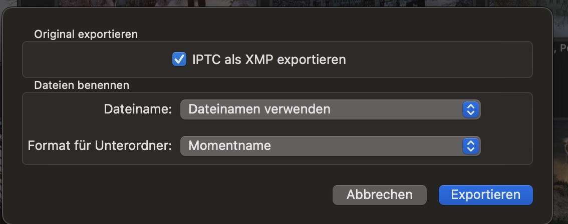 Das Häkchen bei "IPTC als XPM" sorgt dafür, dass die Titel, Orte, Schlagworte und Zeiten in einer separaten XPM Datei abgelegt werden. Viele Programme können diese Metadaten daraus lesen. Fotos schreibt ja nicht die Titel und sonstige Metadaten in die Origale. Ohne dieses Häkchen fehlen sie, wenn wir Originale exportieren.