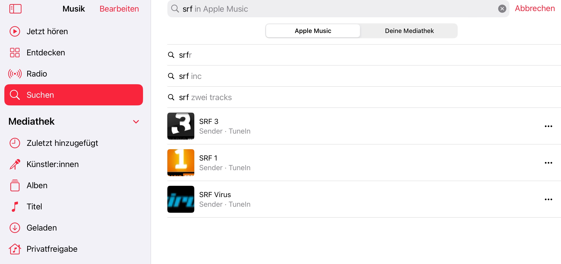 Und wie bereits weiter oben geschrieben, würde ich es mit dem Sprachbefehle auf dem pod versuchen. Vielleicht geht auch der Sprachbefehle auf dem iPhone. Also: „Hey Siri, spiele SRF 1 radio“ danach wird der Sender auch immer im Verlauf von Music angezeigt.