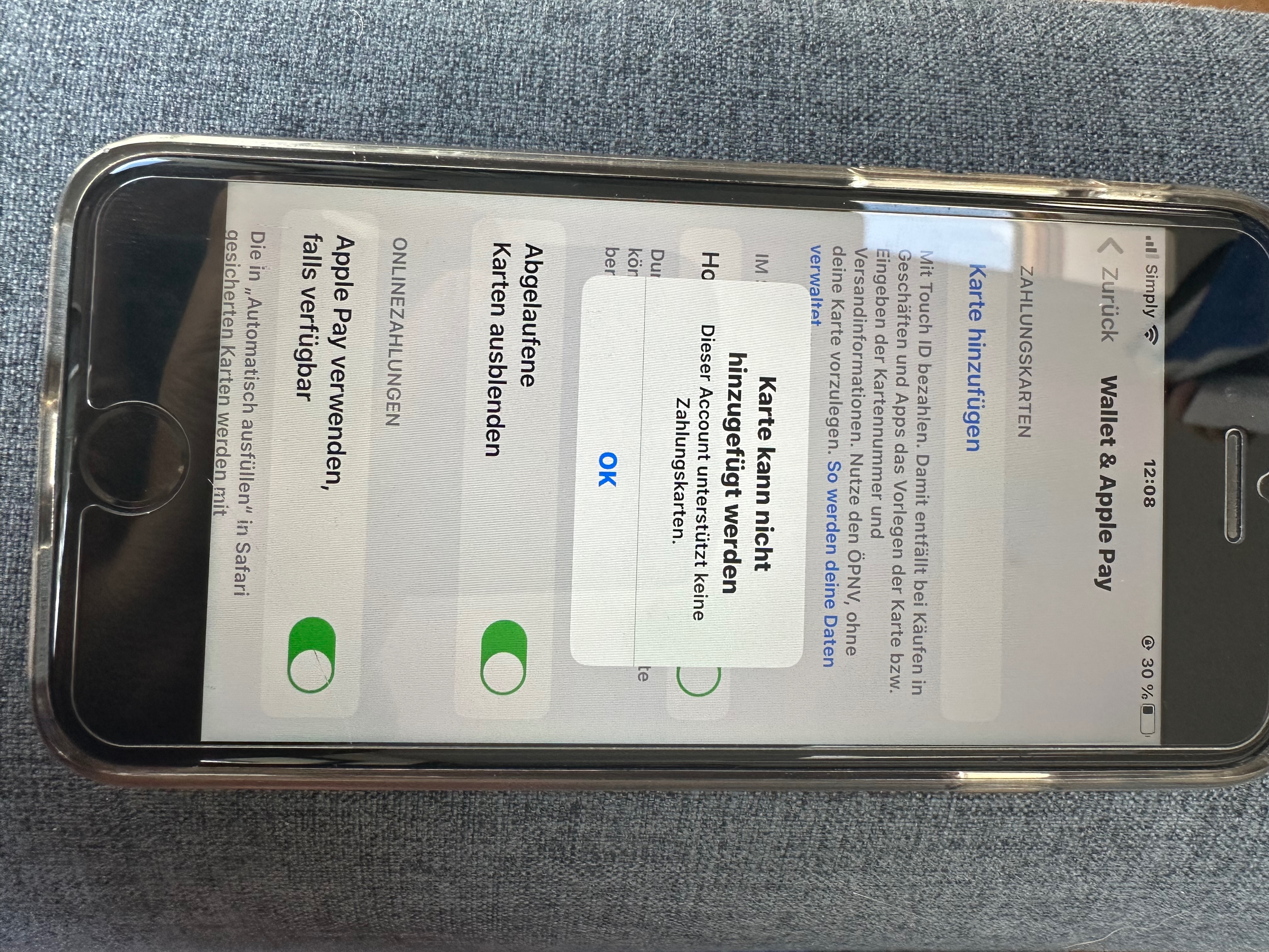 "Dieser Account unterstützt keine Zahlungskarten" bei Apple-Pay-Einrichtung