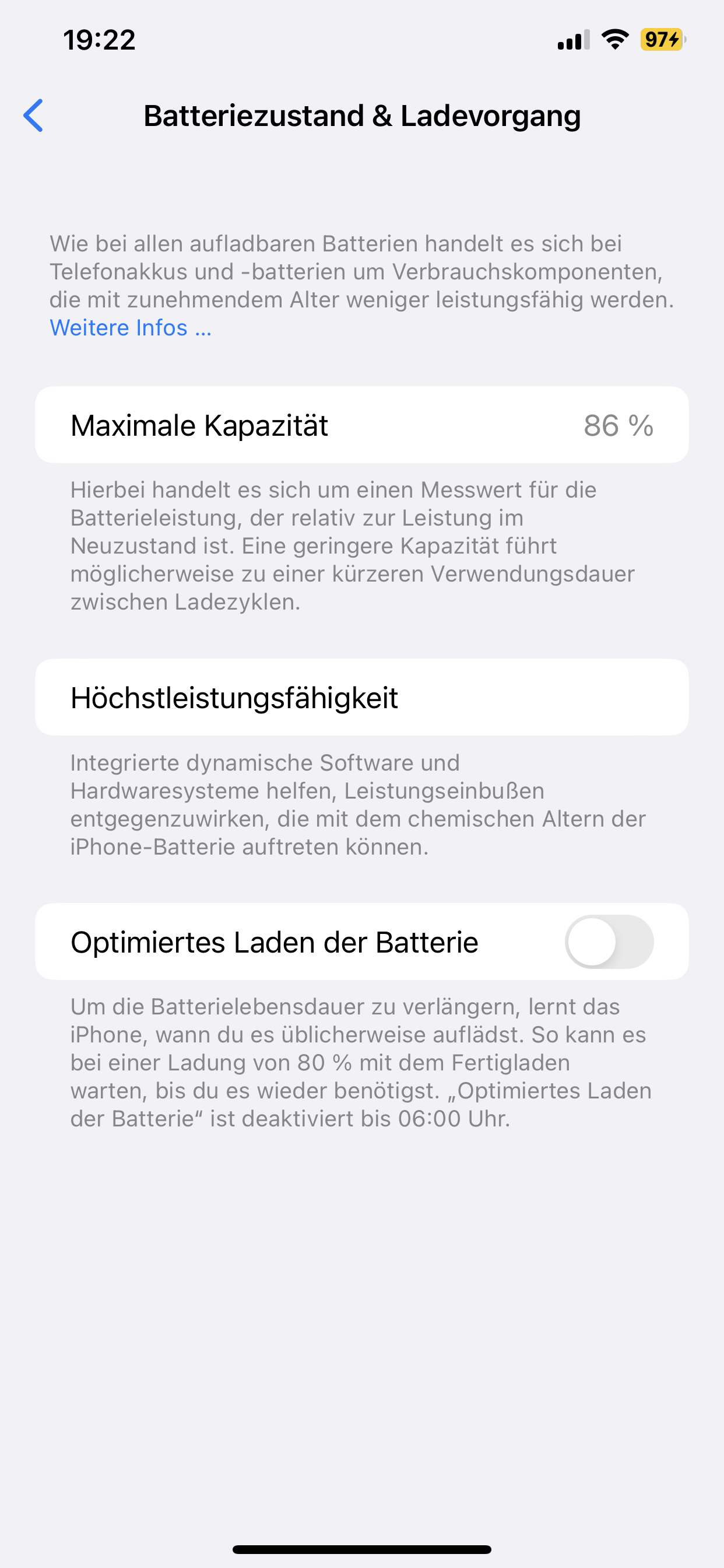 Die von dir gezielte Anzeige ist die verbleibende Leistungsfähigkeit deines Akkus. Im steht also noch 86% des Ursprünglichen Betrages zur verfügung. Dieser Verlust der Leistungsfähigkeit kommt durch eine Abnutzung des Akkus. Das ist vollkommen normal bei Lithium-Ion Akkus. Die Anzeige zeigt aber nicht den aktuellen Ladestand deines iPhones. Diesen kannst im Kontrollzentrum einsehen.