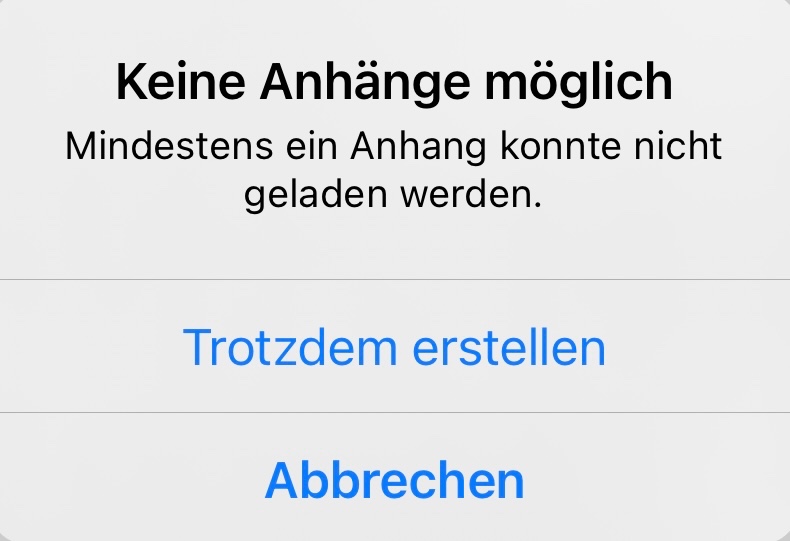 seit ein paar Tagen kann ich keine Anhänge (pdf) mehr an E-Mails hinzufügen. Spätestens beim Abspeichern (unter Entwurf) und neuem Öffnen der Mail erhalte ich die Meldung „keine Anhänge möglich - mindestens ein Anhang konnte nicht geladen werden“.