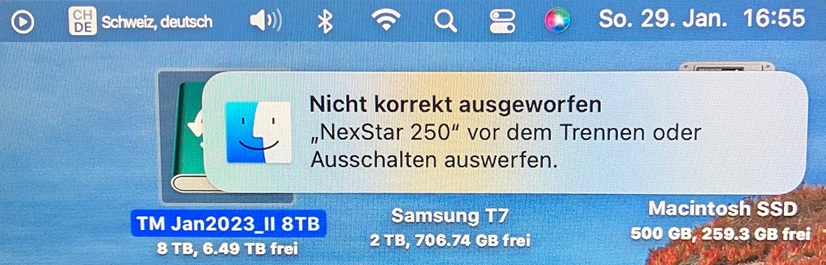 MacOS Version: die Auswürfe passierten bei 8 und 10 TB Platten, und nur, wenn ich diese für TM-Backups in verschiedenen Gehäusen unter Ventura und dann wieder Monterey verwende. Eine Geschichte für sich: ich machte einen Downgrade, weil einige Apps und (aktuelle!) Treiber mit dem iMac Intel i7 nicht funktionierten – wohl aber unter Ventura auf meinem MacBook Pro, dieser aber mit einem Intel i5 Chip. Andere User stellten ähnliche Beobachtungen auch ins Web!