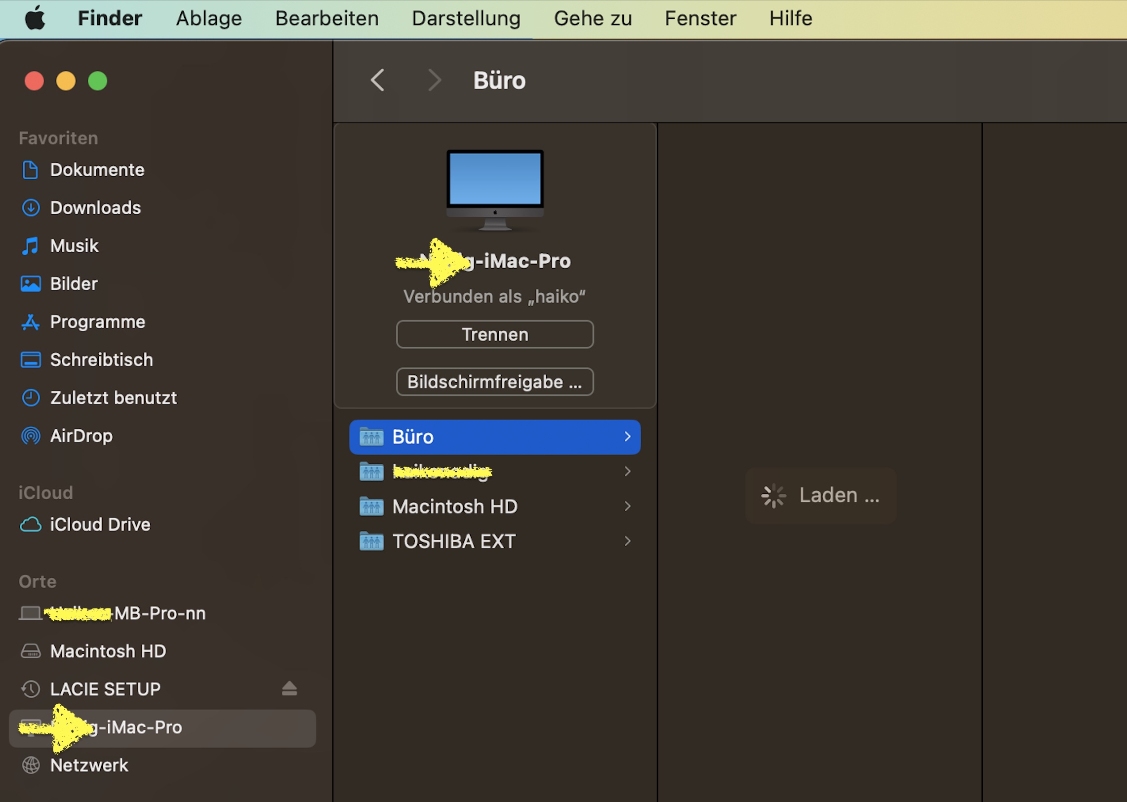 Seit dem Update Ventura 13.2 funktioniert die Dateifreigabe über das Netzwerk nicht mehr vollständig. Wenn ich von meinem Macbook pro auf meinen iMac pro zugreifen will, erscheint zwar der freigegebene Ordner, aber wenn ich diesen anklicke, erscheint nur die Anzeige, dass geladen wird (siehe Foto im Anhang). Leider öffnet sich nach langem Warten nichts. Was kann ich tun?