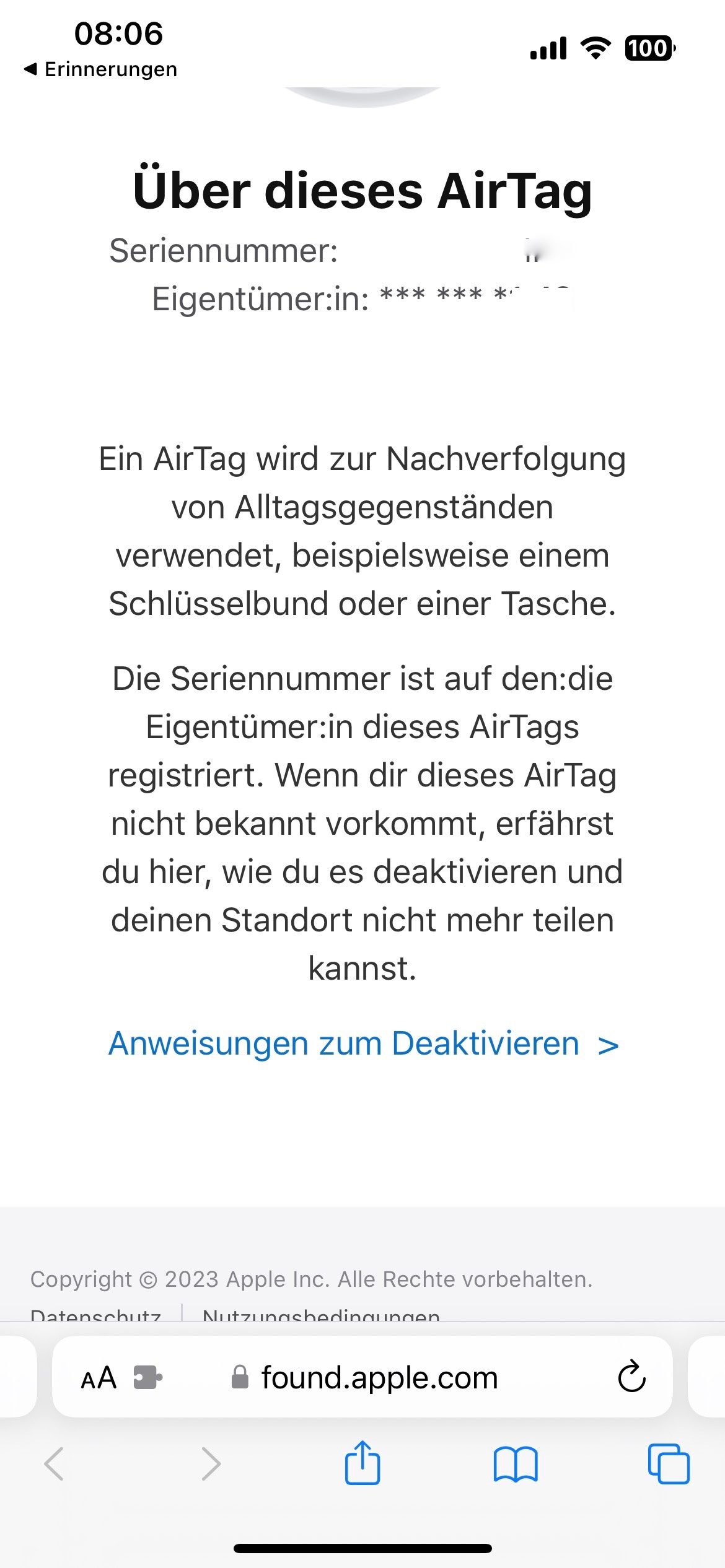 Ich erhalte dauernd die Nachricht dass found.apple.com ein unbekanntes AirTag gefunden habe. Dieses AirTag ist jedoch mein EIGENES, und an meinem Schlüsselbund. Siehe Screenshots unten, die Seriennummer stimmt überein. Ich habe das AirTag auch schon gelöscht, zurückgesetzt, etc, die Nachricht kommt immer wieder. ich habe auch noch andere AirTags welche dauernd bei mir sind (z.B. in meiner Aktentasche), aber bei denen habe ich dieses Problem nichtzz