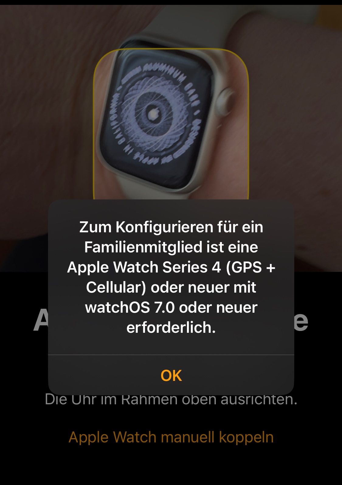 Habe für meine Mutter eine Apple Watch 7 mit ganz aktueller Software gekauft. Trotzdem bekomme ich eine Fehlermeldung dass es eine Watch 4 oder neuer braucht???