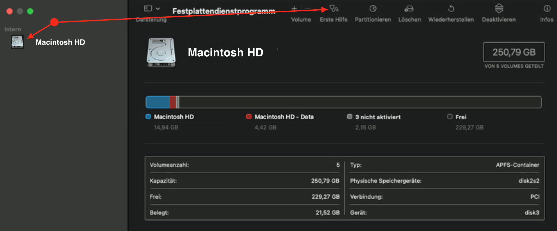 das FPDP (markiert) starten und die "Macintosh HD" mit "Erste Hilfe"