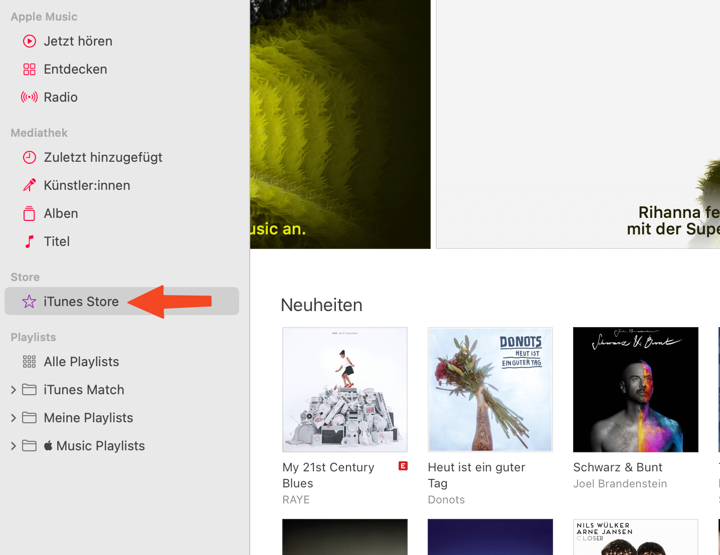 In der Seitenleiste erscheint dann der Eintrag: iTunes Store. Hier solltest du wie gewohnt Musik einkaufen können.