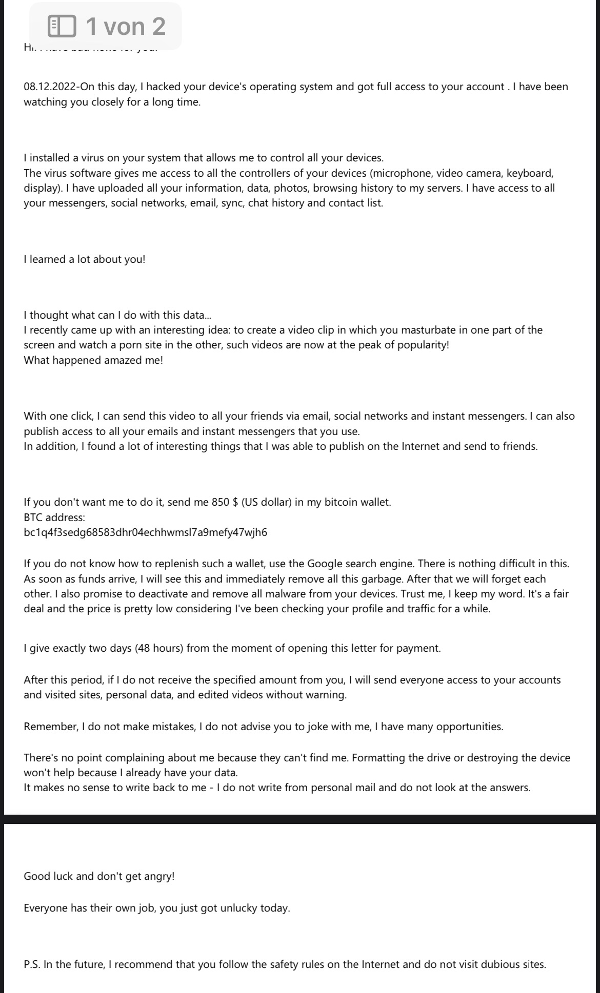 Heb die mail auf, melde den Vorfall der Polizei und erstatte Anzeige ❗️