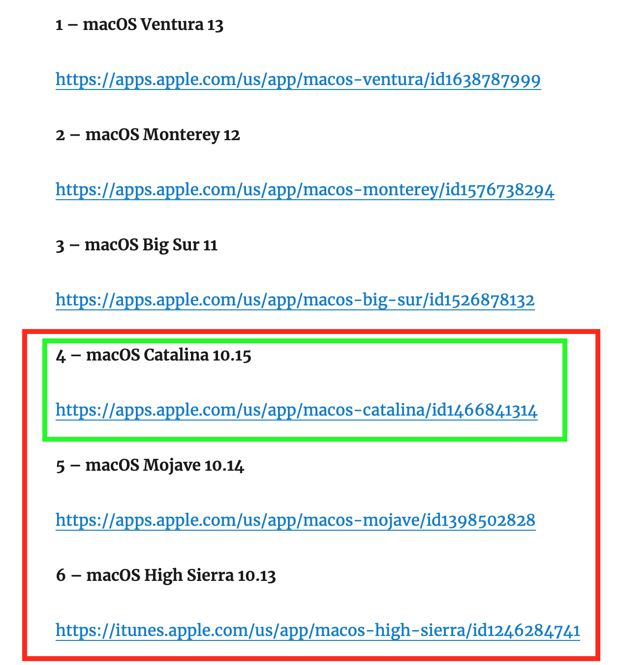 eines der markierten MacOS (wieder auf der Seite runterscrollen), vorzugsweise Catalina, durch Klick auf den jeweiligen Link aus dem App Store "Laden" und nachfolgend auf dem Zweitgerät installieren