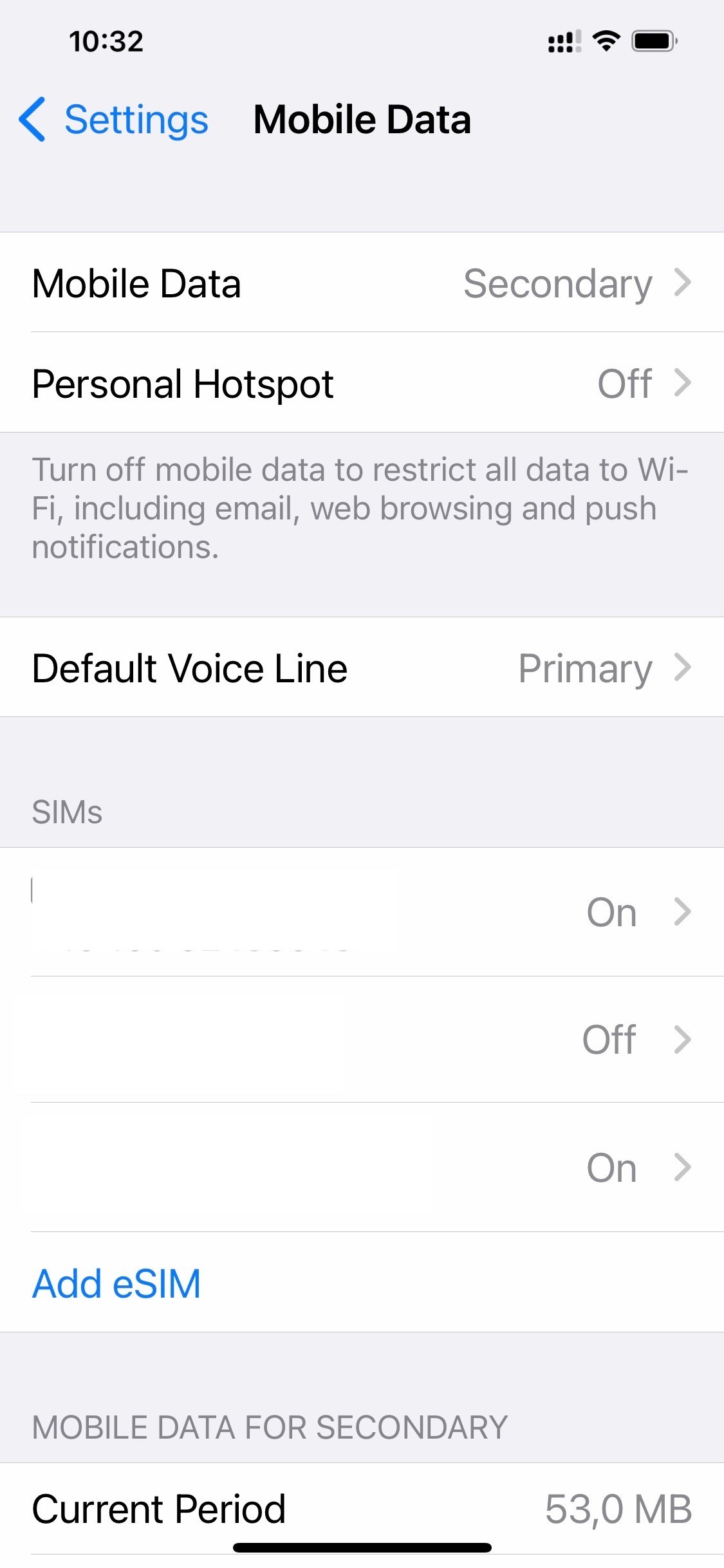 leider war meine Vorfreude unrealistisch - ich schicke mal zwei Screenshots von meinen aktuellen Einstellungen mit: (0160) ist die Nummer mit der physischen Telekom-Mobil-Karte, (0173) die der eSIM von Congstar.