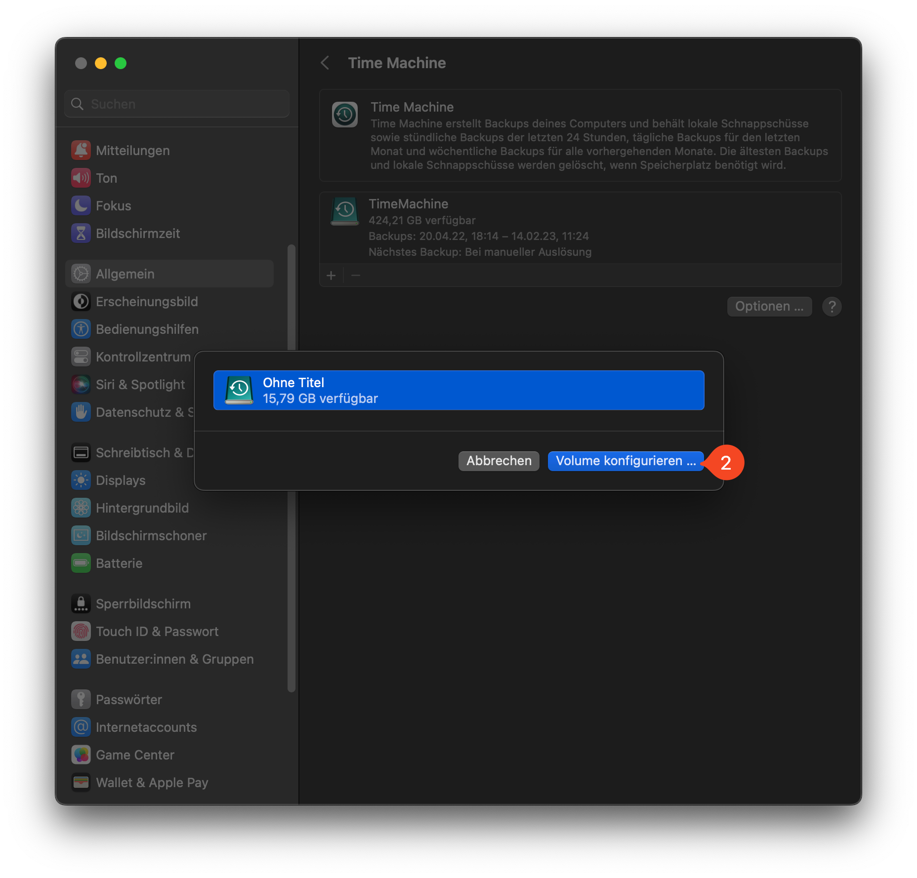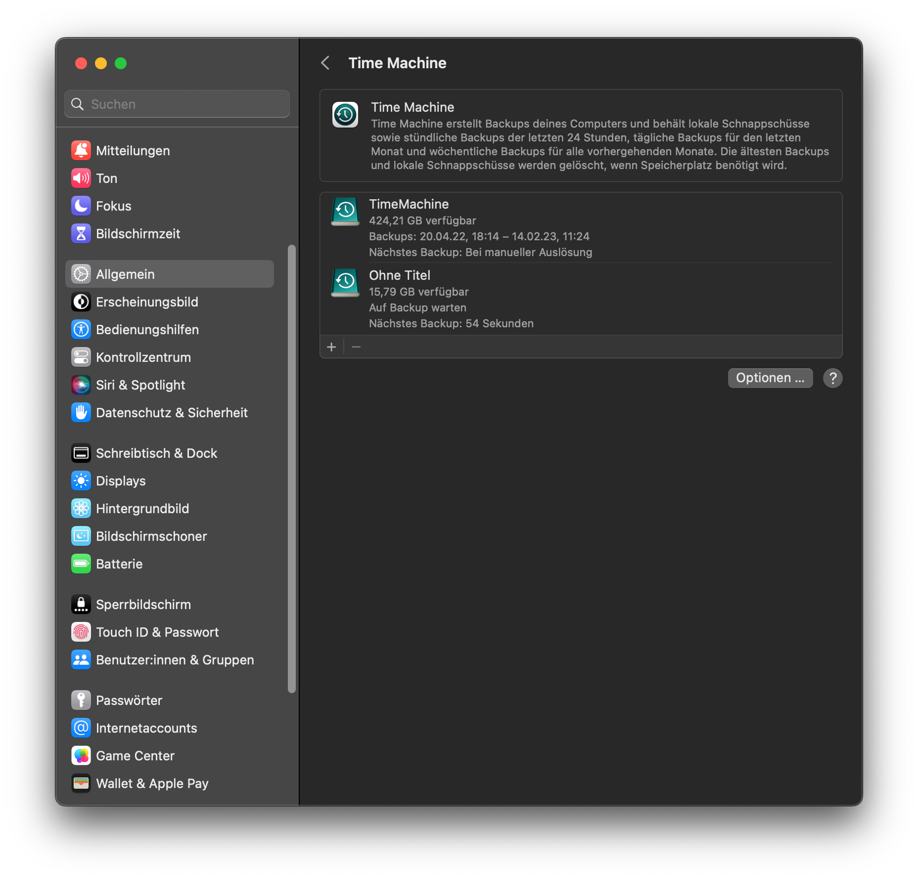 Hallo, erst einmal DANKE. Ich hatte mal eine Lösung mit 2 Platten, die im stündlichen Wechsel ein TimeMachine-Backup von einem iMac zogen. "Damals" (vor ca. 3 Jahren?) gingen maximal 2 Platten, die man als Time-Machine-Volumes definieren konnte. Da ich aufgrund eines früheren Datenverlustes etwas paranoid bin, möchte ich aber 3 Volumes haben, wenn ich meinen neuen Mac produktiv nehme. Von daher ist die Frage, ob man mittlerweile (MBP 13" M2 CPU, 24 GB, 2 TB, macOS Ventura) mindestens 3 Platten dran hängen kann, die explizit als TimeMachine-Laufwerke fungieren (USB-Platten, extern) und nach einander, im stündlichen Abstand, jeweils das aktuelle Backup ziehen. Eine der drei Platten will ich dann effektiv nur einmal im Monat dranhängen und sie bei meinem Vater lagern, so dass ich sie immer noch habe, auch wenn mir hier die Hütte abbrennen würde.