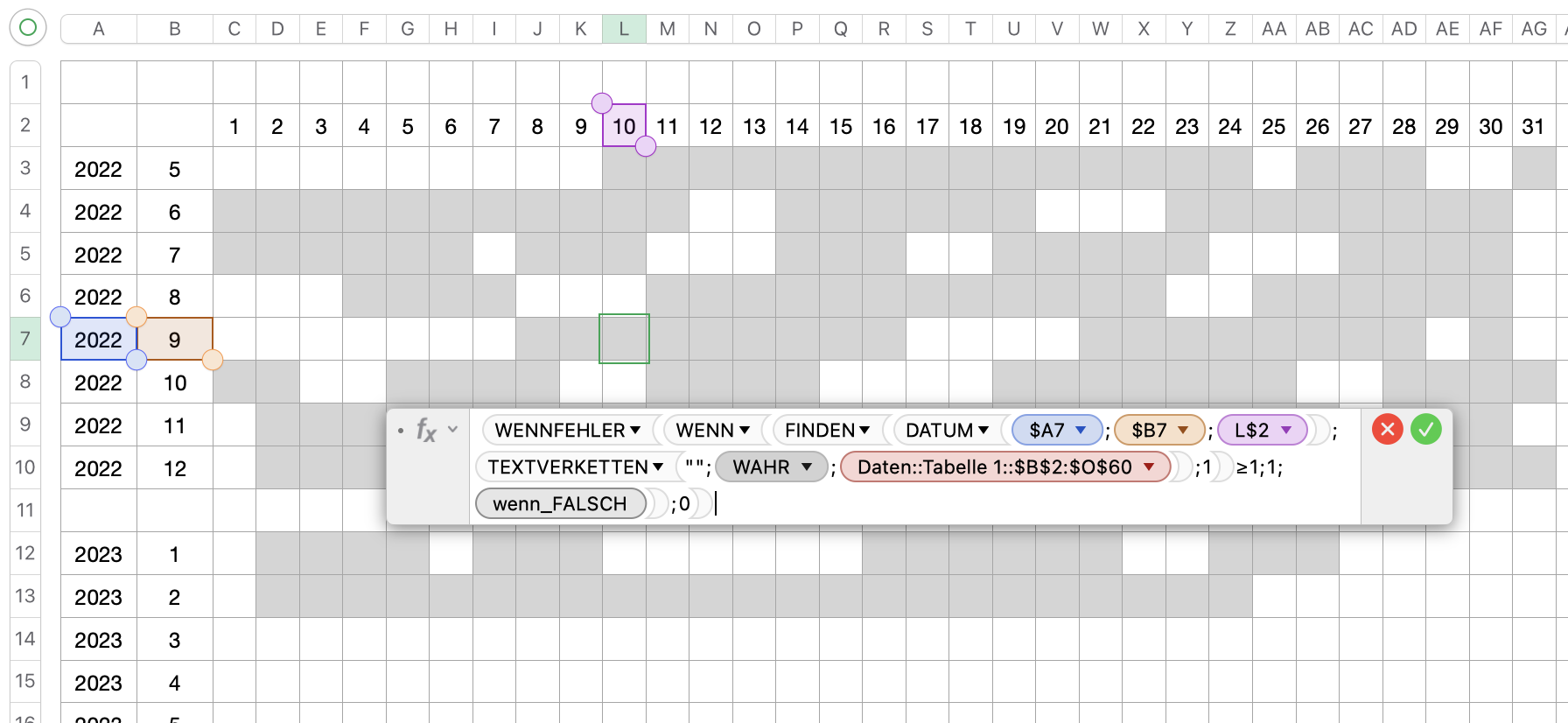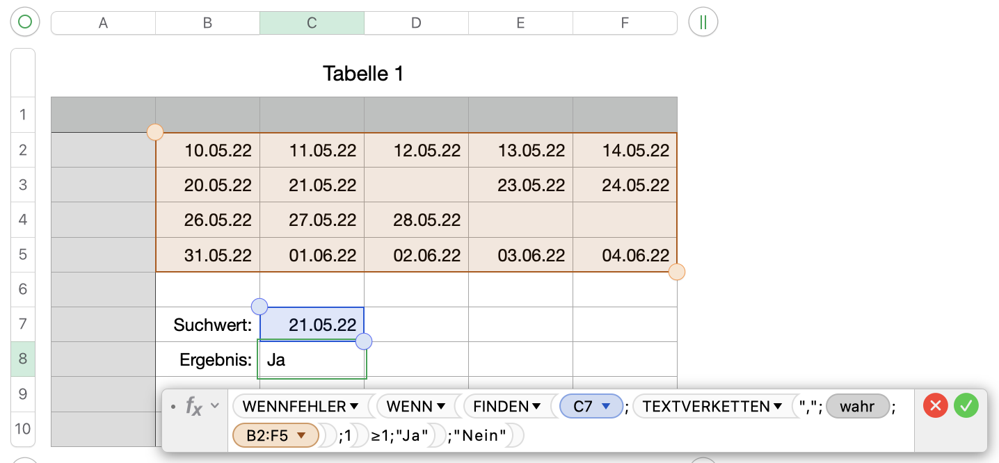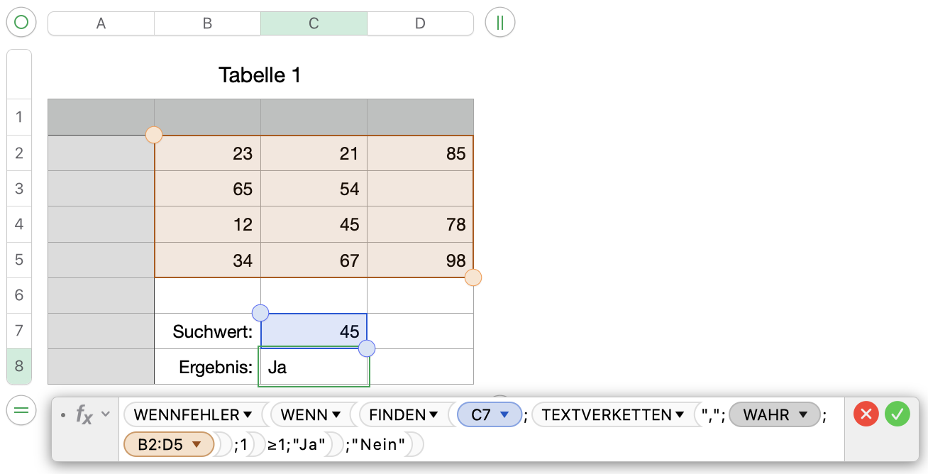 ich würde gerne den Bereich B2:D5 nach den Suchwert in C7 durchsuchen und in C8 als z.B. ja oder nein ausgeben. Ich bekomme es mit xVergleich oder xVerweis (auch verschachtelt) irgendwie nicht hin, da ich horizontal und vertikal in einer quasi ungeordneten Tabelle suche.. Die Tabelle ist tatsächlich nur eine Ansammlung von "gleichen" Daten welche ich leider nicht anders darstellen kann (z.B. nur in einer Spalte untereinander)..