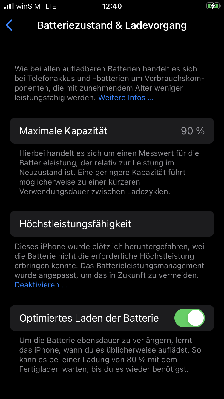 Die Akkuanzeige sowie Akkukapazität zeigt 100 %.