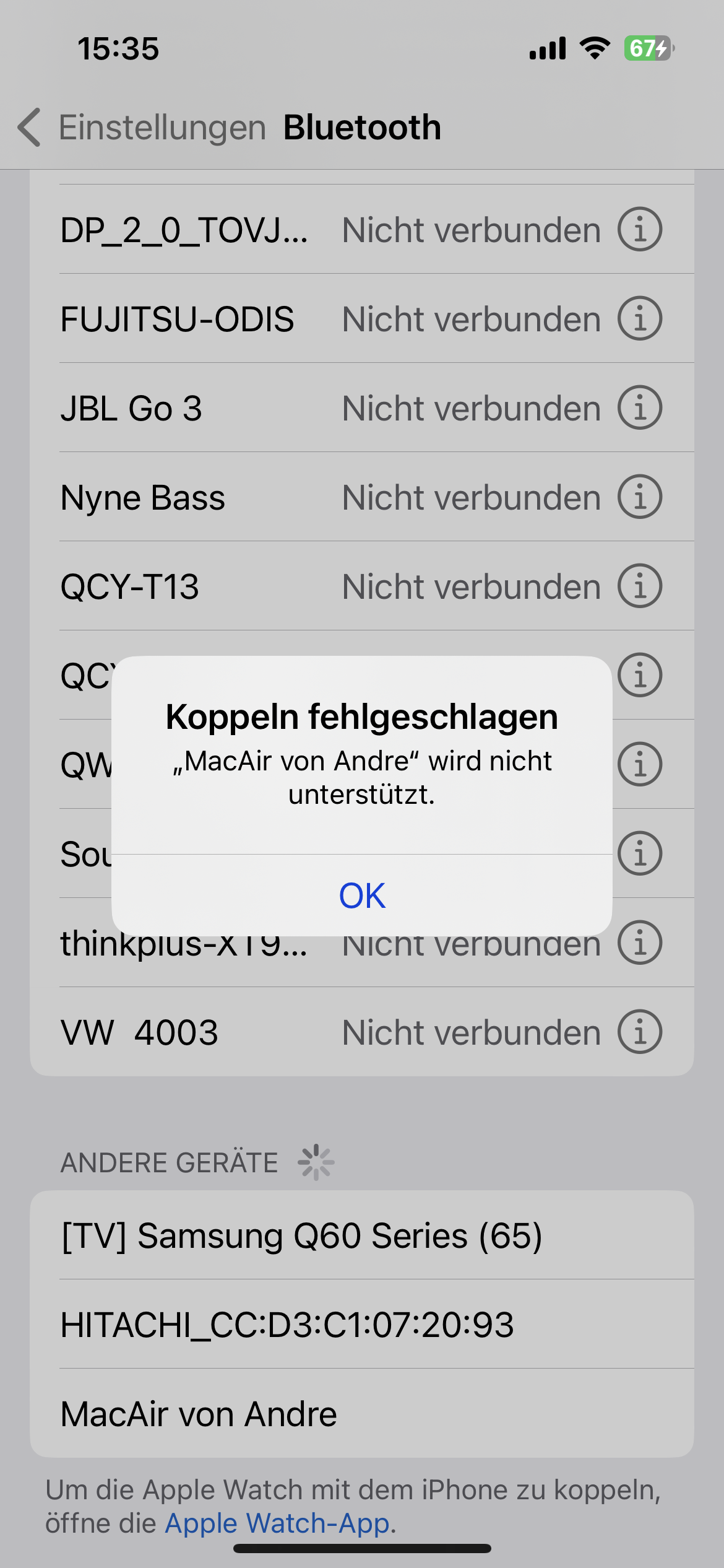 Bei iPhone steht "Koppeln fehlgeschlagen Mac wird nicht unterstützt".Hab ich beides geräte neue start gemacht aber trotzdem.