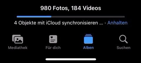 Was passiert denn, wenn du weitere Fotos machst? Bleibt die Anzeige auf 4 Objekte oder geht diese entsprechend hoch? Hast du die Synchronisation mal angehalten und wieder gestartet? Am besten funktioniert die Synchronisation, wenn das iPhone an eine Stromquelle angeschlossen ist und über WLAN verbunden ist.