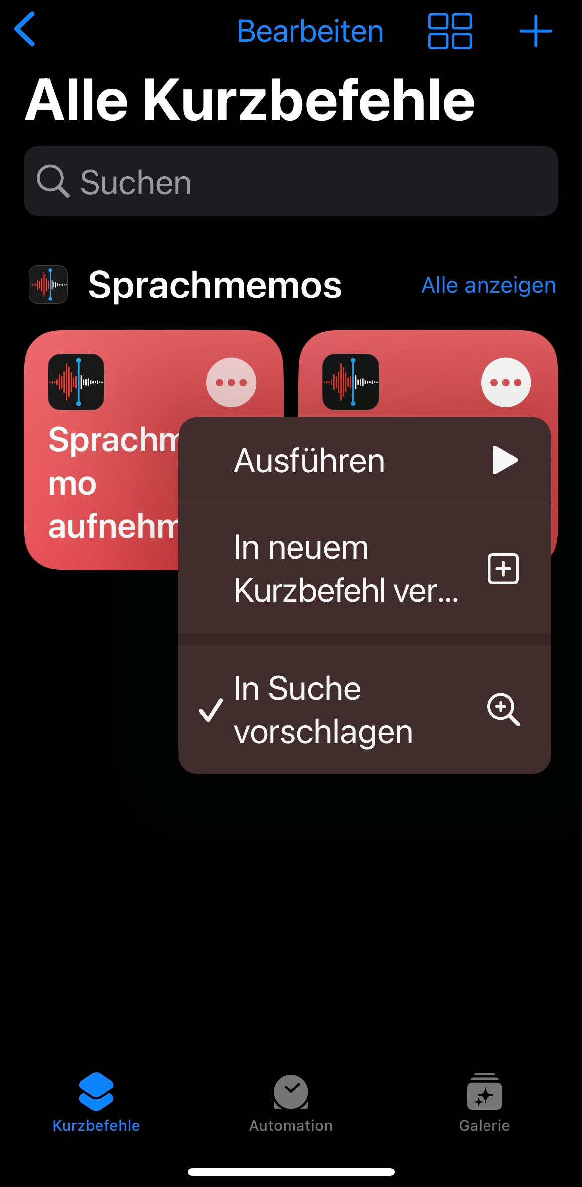 Kurzbefehle "Sprachmemo aufnehmen" und Letzte Sprachmemo wiedergeben" in