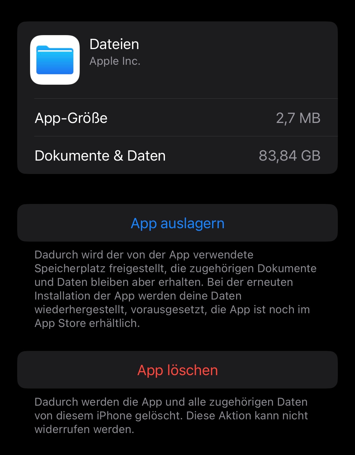 wenn ich einen Blick auf die Belegung meines Speicherplatzes am iPhone werfe fällt mir auf das die Dateien App 83,84 GB Speicherplatz belegt.