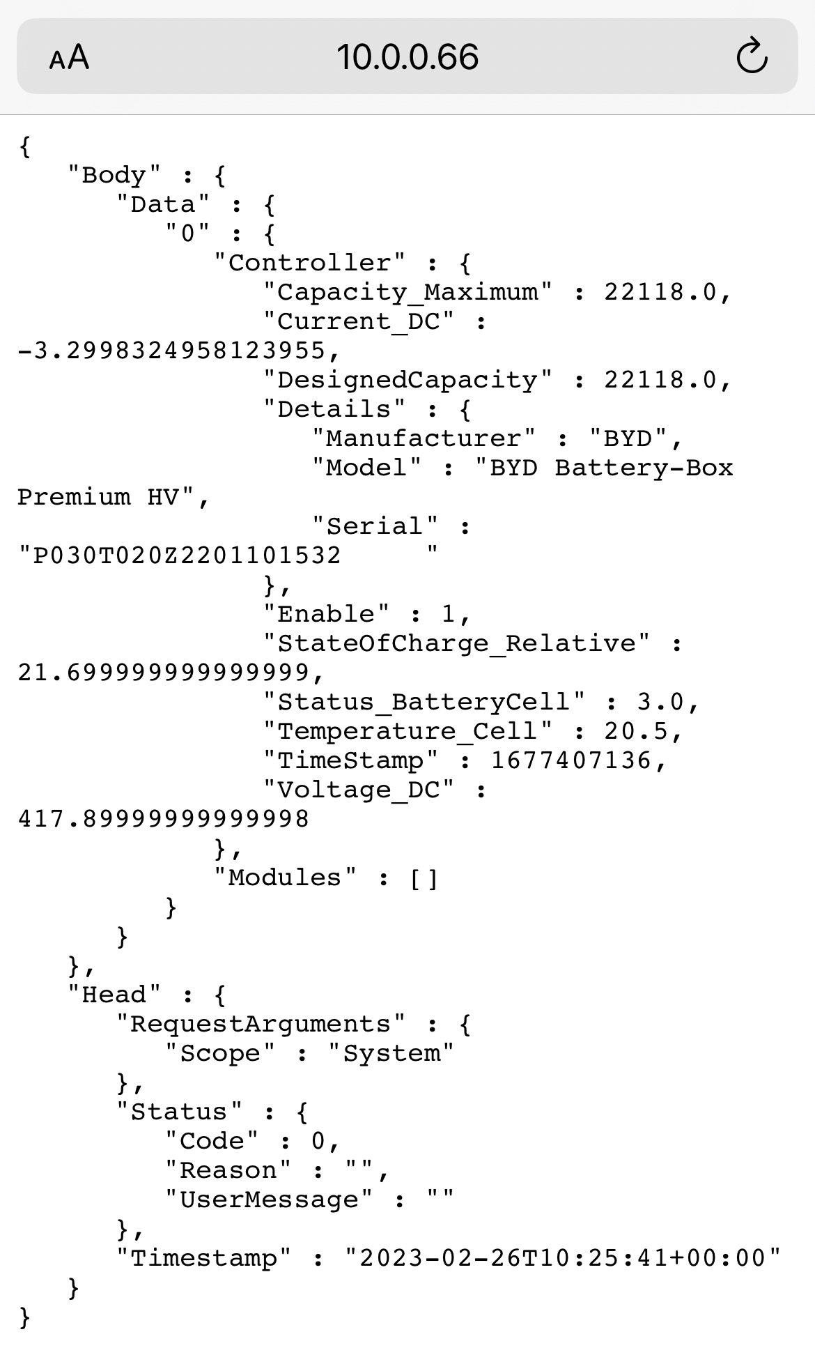 Die API des Wechselrichter liefert über eine einfache URL Netzwerkabfrage eine JSON Datei.