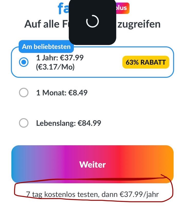 ich bräuchte ganz dringend eure Hilfe. Ich habe mir eine App runtergeladen und wollte die Premium Featured ausprobieren. Es gab in der App ein jährliches Abo, wo stand, dass ich 7 Tage lang ein kostenloses Probeabo bekomme und danach jährlich 37,99€ bezahlen muss (falls ich nicht kündige). Ich habe den Kauf bestätigt und auch, dass ich keinen Widerrufsrecht habe, sonst konnte ich das Abo nicht aktivieren.
