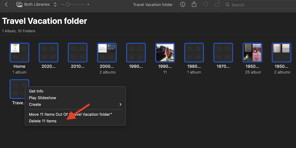 In der Darstellung "Albums" kannst du versuchen, mehrere Ordner gleichzeitig auszuwählen, indem du ein Auswahlrechteck darüber ziehst. Dann kannst du die Auswahl gemeinsam rechst-klicken oder die Steuerung-Taste gedrückt halten, während du die Auswahl klickst und auswählst, die Objekte zu löschen.