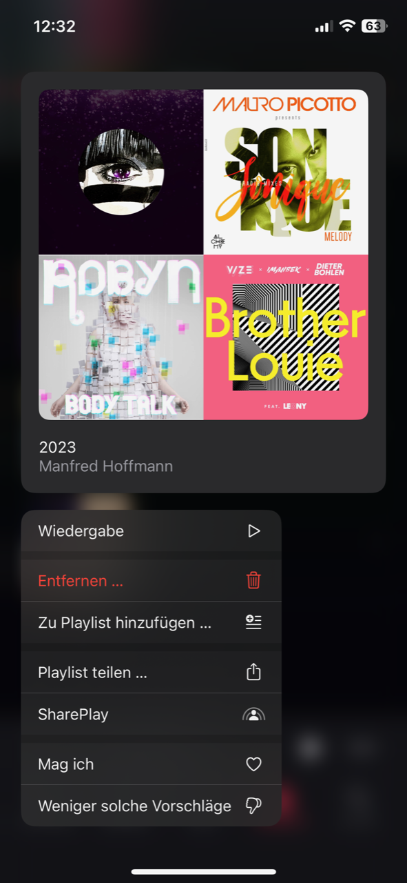 Habe es genau nach der Anleitung von Apple versucht. Allerdings wird bei mir dann "zu Mediathek hinzufügen" nicht angezeigt. Ich halte also auf der Playlist gedrückt und das Popup geht auf, nur die oben genannte Auswahl fehlt.